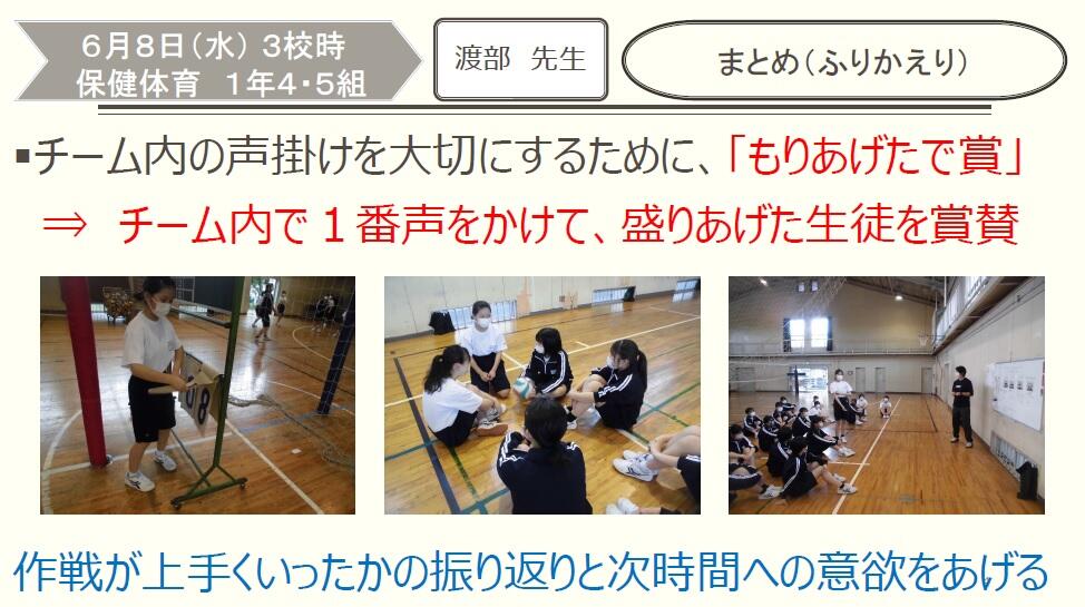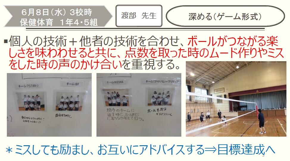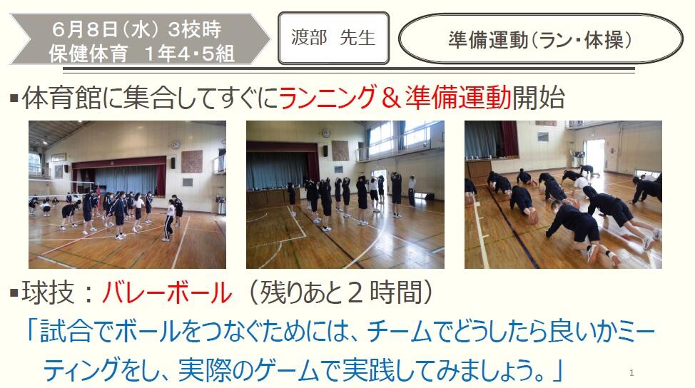 〇1年生はバレーボールに関してはほとんど未経験者ばかりでしたが、パスやサーブの基礎スキルを身に付け、ゲームによってその楽しさを味わいながら、スモールステップの目標を達成させようとする指導者のねらいがはっきりとした授業でした。
