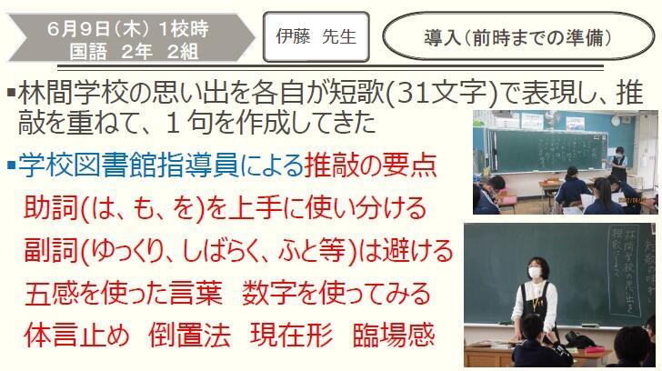 〇林間学校の思い出を短歌にする授業です。短歌という字数を制限された中に、自分らしさや情景が伝わりやすいような「言葉を選択・精選」することにより、国語の力が養われます。