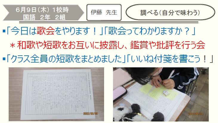 〇2学年全生徒の短歌を楽しく読ませてもらっています。私がこのクラスで一番「時間や空間の捉え方が上手」と思ったのは、次の短歌です。