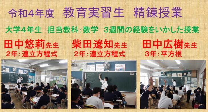 〇先月の23日から3週間、本校卒業生の3名が教育実習を行い、本日最終日になりました。3人とも数学科という珍しいこともありましたが、昨日の授業はそれぞれ準備した内容を精一杯取り組んでいました。生徒に年齢が近いので、気持ちが通じ合うこともあったと思います。