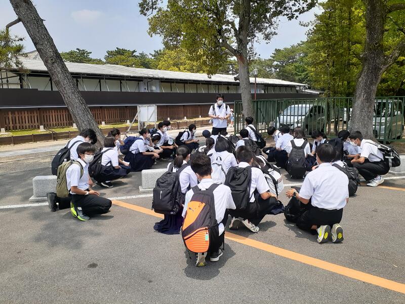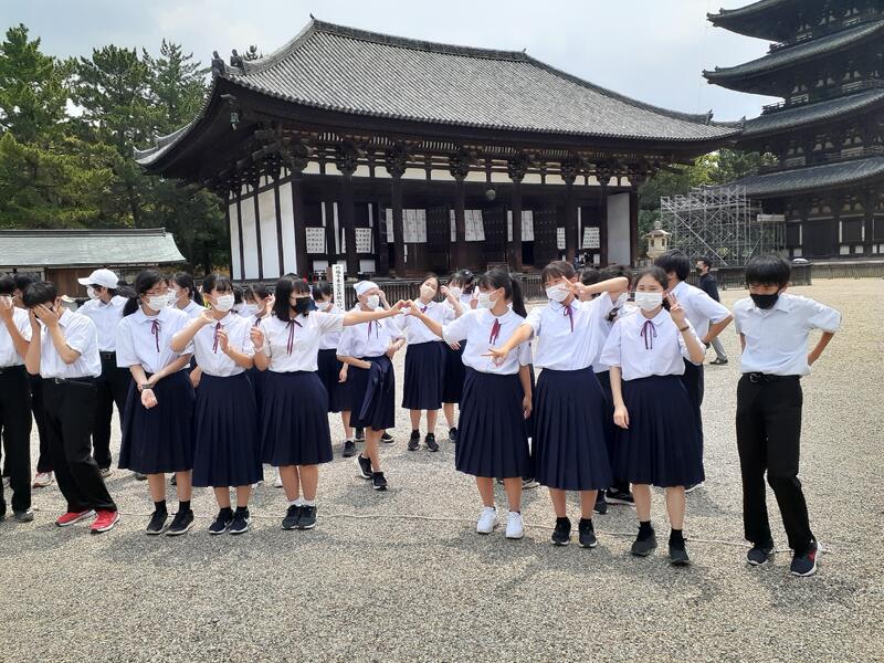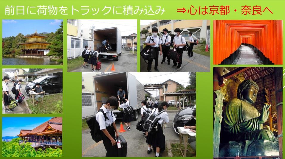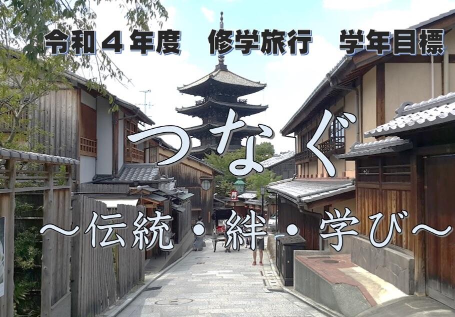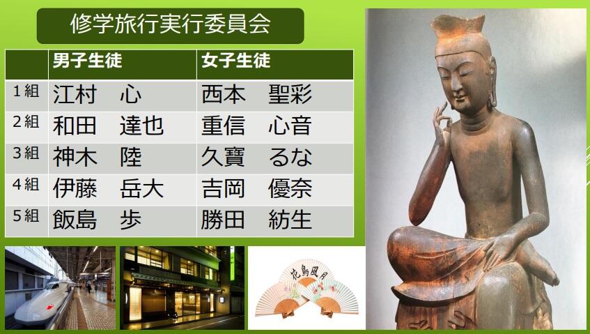 〇私からは、「京都や奈良は大都会でビルも多いですが、ちょっとした脇道やあまり大きくない建物にも古い歴史を感じることができます。この2ヶ月間、君たちの姿をみてきましたので、2泊3日の旅行に関してはまったく心配していません。ただ一つお願いがあります。1日目の奈良市内(6時間)及び2日目の京都市内(9時間)の班行動の中で、予定通りに行かないことやトラブルが起きると思います。その際はまずどうしたらよいかを一人一人が考え、次にそれを出し合って班で話し合いをしてください。その上でリーダーがみんなの考えを踏まえた決断をしてほしいです。」と話しました。