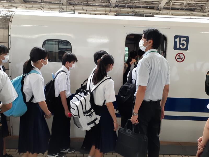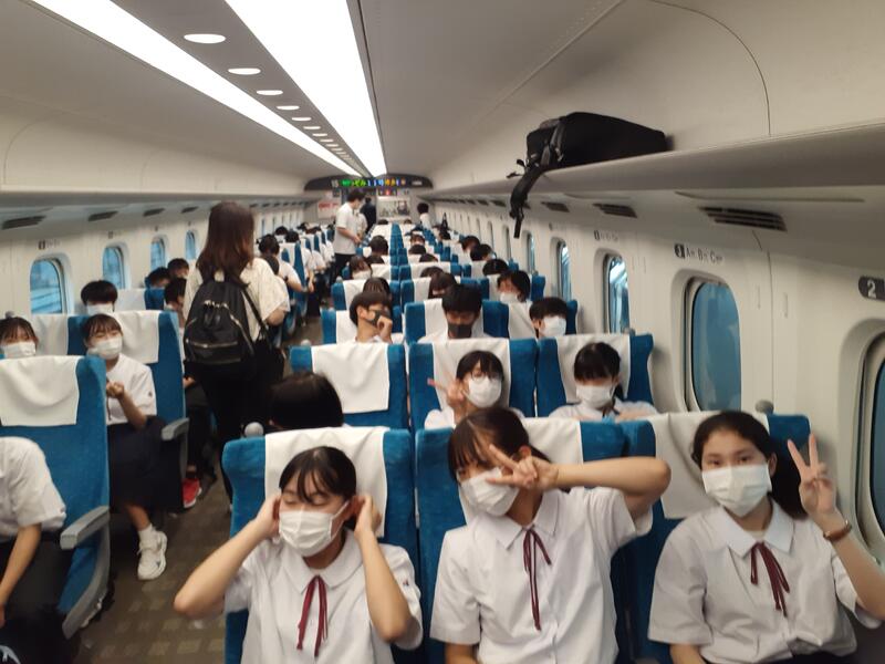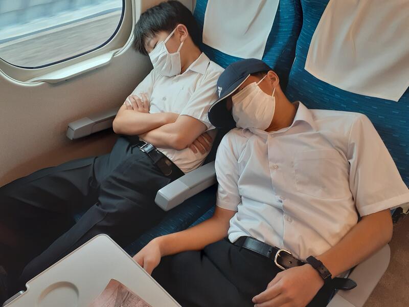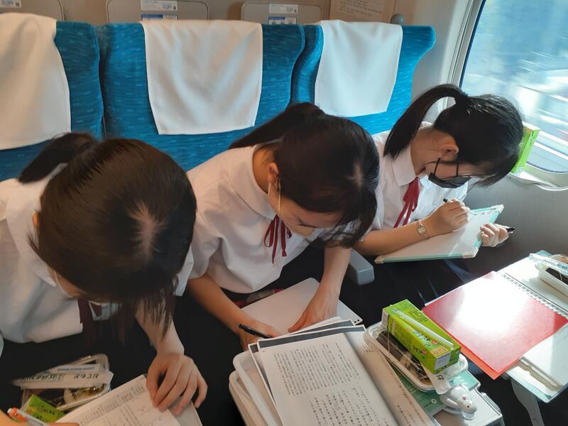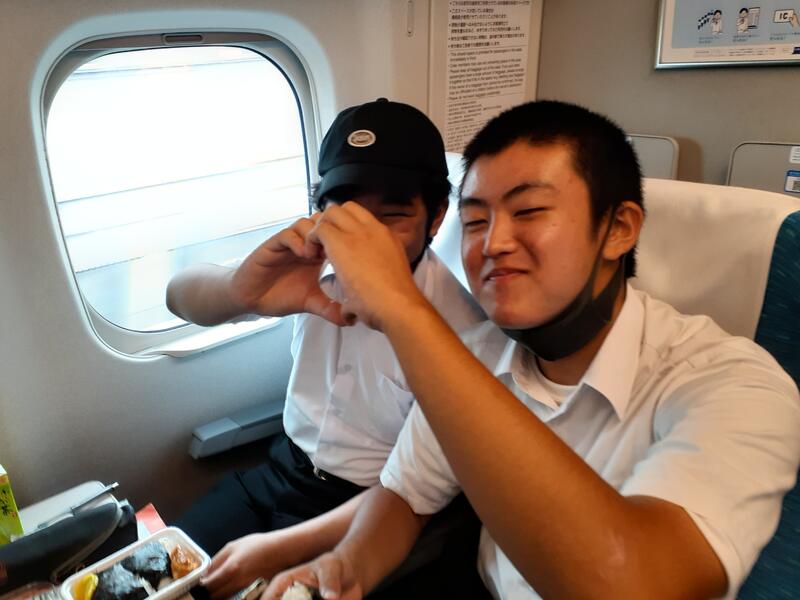 新幹線内は勉強する生徒、朝ごはんのおにぎりを食べる生徒、おやつも時間を決めて食べています。