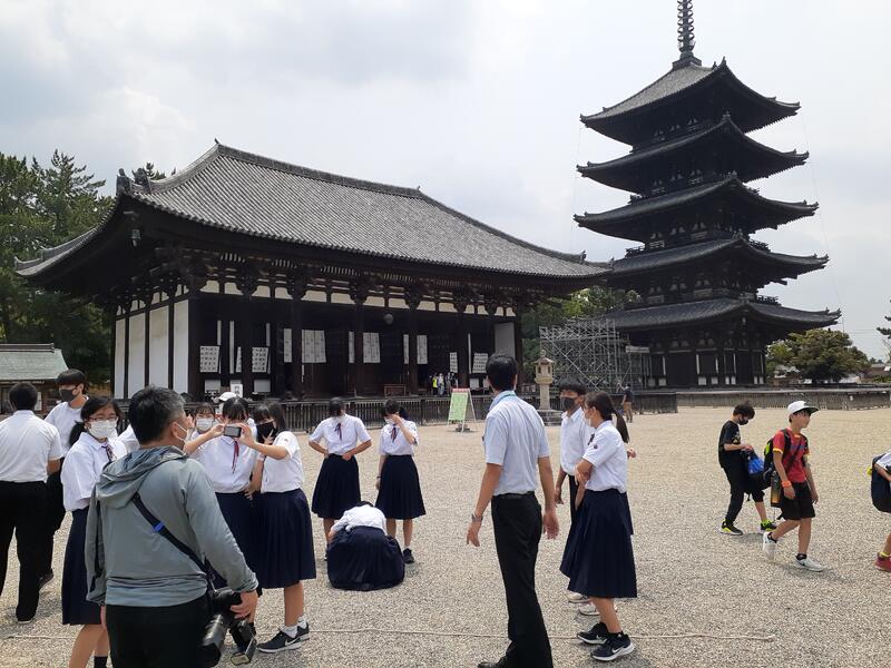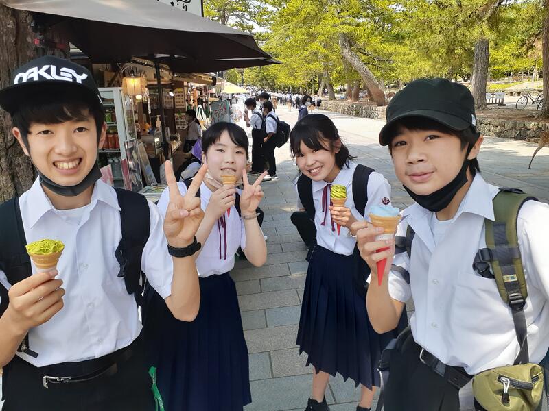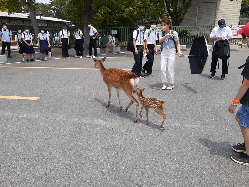 奈良公園は薄曇り、気温29℃、時より爽やかな風が通り過ぎていますが、風が止まると蒸し暑いです。班別行動中です。昼食の店もあらかじめ調べてあるはずですが、果たして上手く見つけられるでしょうか?少し暑さから具合の悪い生徒が出てきて、教員が分担して対応しています。