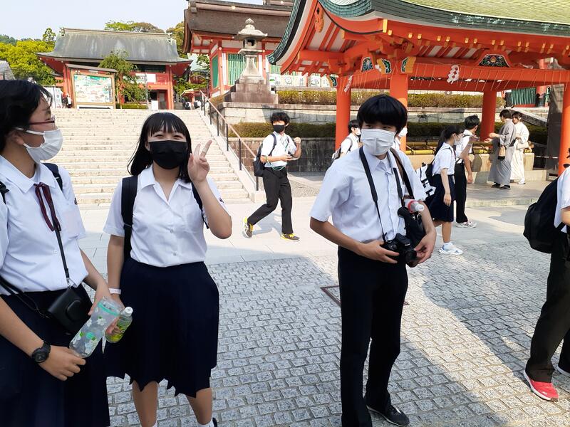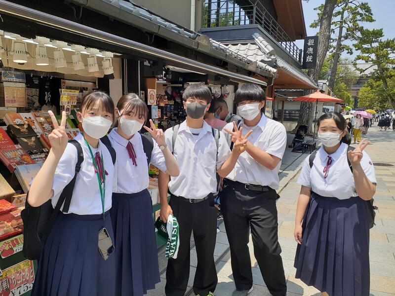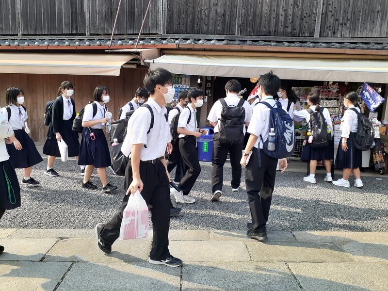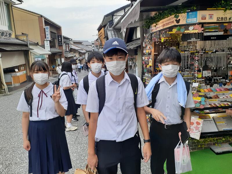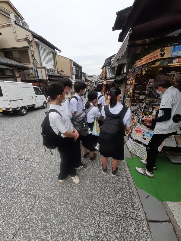 本日、多くの班が訪れるのは、清水寺、二条城、金閣寺、銀閣寺、祇園、錦市場、嵐山の渡月橋などです。生徒は市内のバスや地下鉄が乗り放題の「一日フリー乗車券(800円)」を効率的に使って、まわるように自分たちで計画しています。