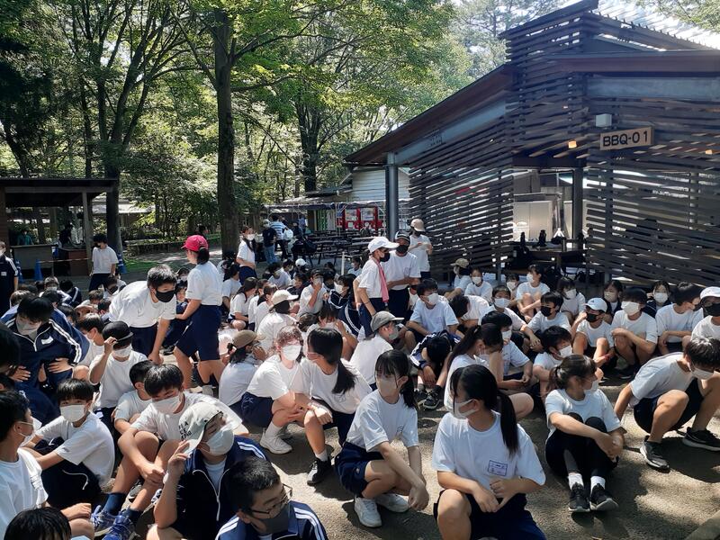 後片付けも終わり、帰りの支度で、集まりました。気温は36℃に上がり、木陰にいても蒸し暑さは相当なものです。常に飲んでいないと、干上がってしまう感じです。健康観察では大きな体調変化は、ありません。無事に帰りたいです。