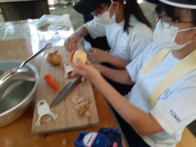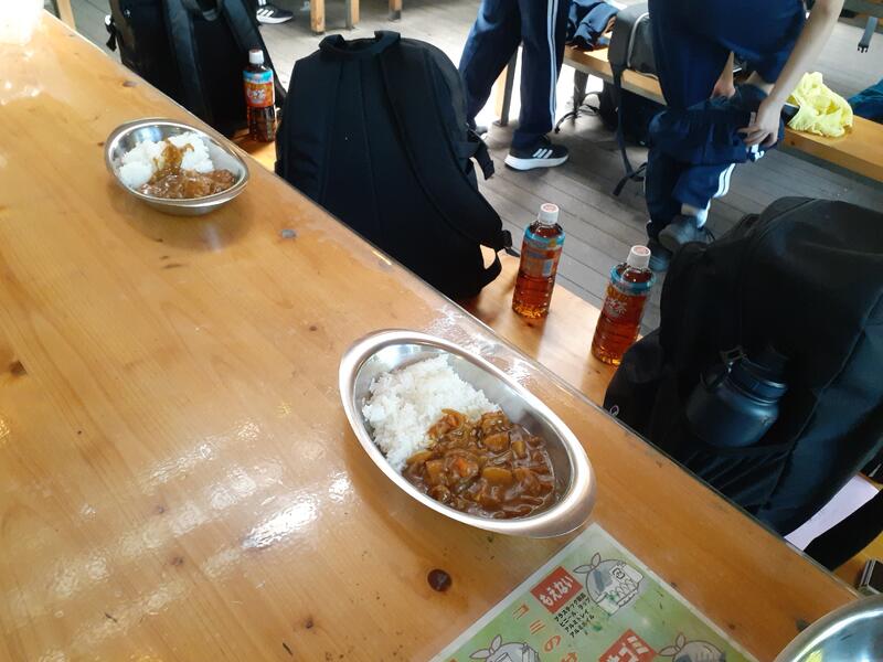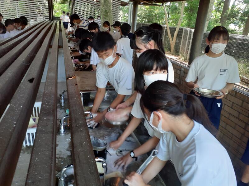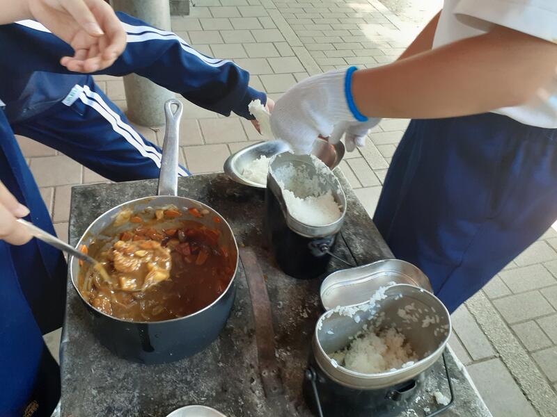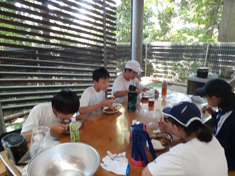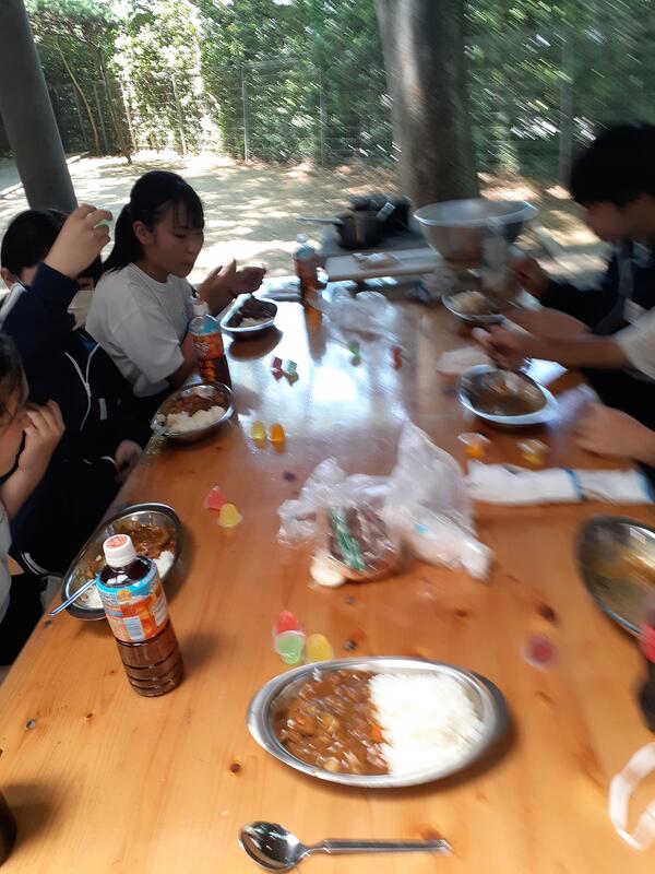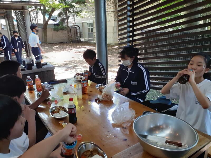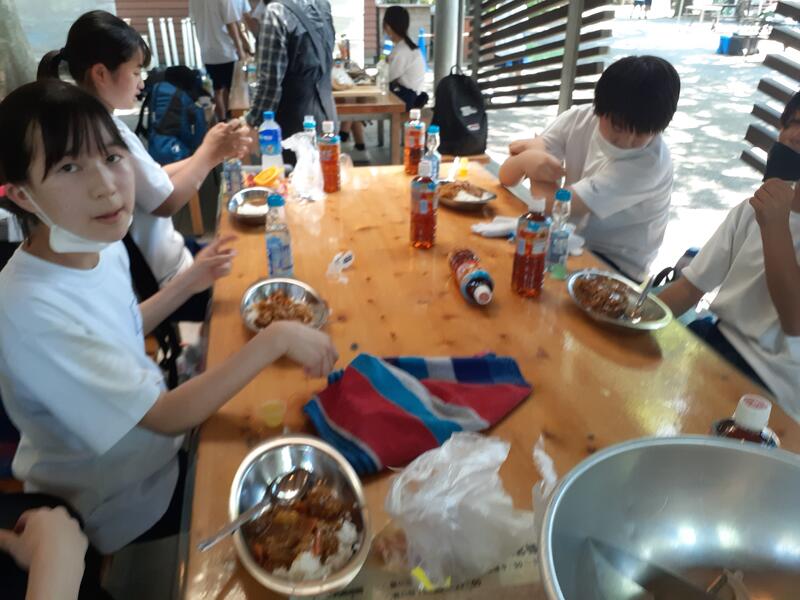 あちらこちらから「いただきます」と大きな声が聞こえます。暑さと闘いながら、みんなて作ったカレーライスの味は、いつもとはちょっと違って、「深くて何とも言えない」味かもしれません。私も一組2班が作ってくれたカレーを一緒にいただきました。気を利かせて大盛にしてくれたのですが、いつもよりも多いので、何とか食べきりました。
