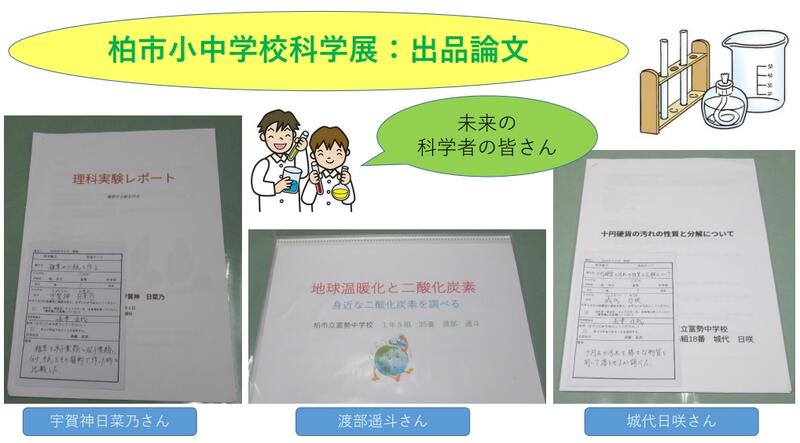〇身近な事象に疑問をもち、「自分で調べてみたい」という自主的な動機をきっかけに、未来の科学者が育っていくことを楽しみにしています。もしお時間がありましたら、他の小中学校の作品もご覧になれますので、さわやかちば県民プラザまで足を運んでみてください。