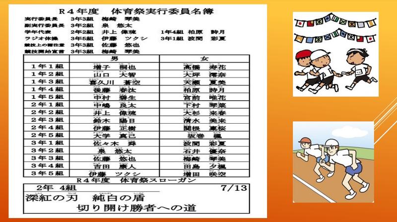 〇今年の体育祭のスローガンは、2年4組からの提案された次の文言が、体育祭実行委員会(委員長:3-3梅崎琴美さん、副実行委員長:泉 悠太さん)で承認&決定されました。