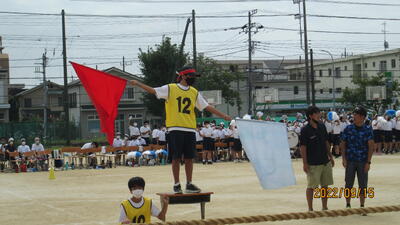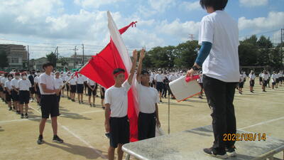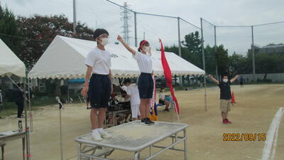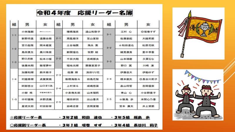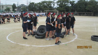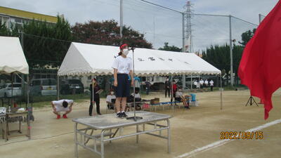 最後に、今回のテーマは、「深紅(しんく)の刃(やいば) 純白(じゅんぱく)の盾(しーるど) 切り開け 勝者への道」です。赤組リーダーの和田さん、坂巻さん、自信はありますか?白組リーダーの飯島さん、長谷川さん、準備はいいですか?「富勢中スピリット」を保護者の皆様にお見せしてください。それでは生徒のみなさんよろしくお願いいたします。
