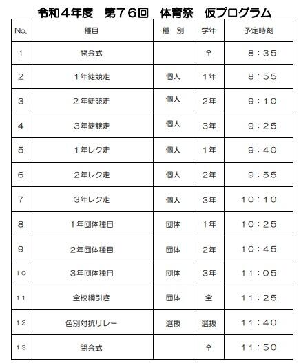 〇今日から体育祭練習が本格的に始まりました。基本的に各学年ごとに、「徒競走」「レク走」「団体種目」の選手決めやルールの確認をしたり、全校綱引きや色別対抗リレーの練習を行ったりしています。