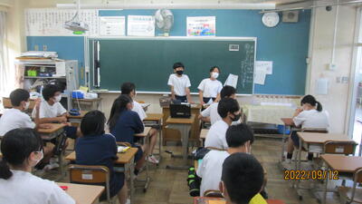 〇朝は各学年の生徒昇降口で立っての投票の呼びかけ、帰りの会ではリモート(図書室から配信)で、各教室に向けて演説(立候補の動機や当選した後の公約など)をしています。