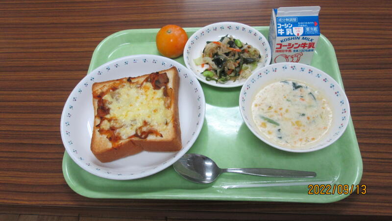 〇今日の給食メニューは、「ピザトースト、かみかみ海藻サラダ、豆乳入りコーンポタージュ、冷凍ミカン」です。私はいつものように、「検食で」生徒達よりも30分早く食べましたが、ピザトーストの程よい塩分が汗をかいた身体にはピッタリです。また生徒達は特に冷凍ミカンに大喜びすることでしょう。たくさん食べてほしいです。
