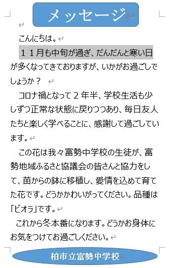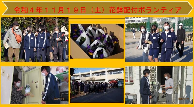 〇19日の土曜日、富勢地域ふるさと協議会及び各町会・自治会の皆さまとボランティアの生徒が一緒に、これまで育ててきたビオラの花鉢をお手紙と一緒にお宅に伺って、配付してきました。