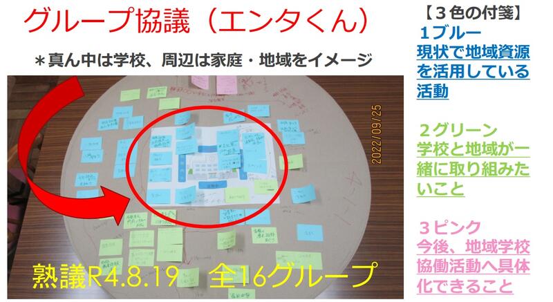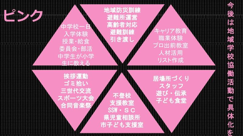 〇19日(土)の15時より、「第10回柏市立富勢中学校区学校運営協議会全体会議(富学協)」をオンラインで行いました。中心の議題は、8月に協議会委員の方々と4校の教職員が行ったグループワーク「熟議」の結果報告と今後「4校合同の挨拶運動」を行っていくという提案があり、了承されました。