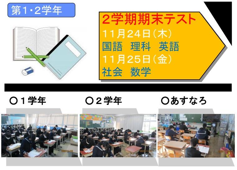 〇昨日と今日は、1・2学年は定期テスト、3学年は実力テストを行っています。今日は特に給食もなしで下校となり、午後は家庭で過ごしますので、安全などに気を付けるように、声をかけてください。時より近隣の方から「中学生の自転車の乗り方が悪い」などの電話や情報をいただきますが、ほとんどが放課後に自宅から出かけた場合のことですので、学校でも指導をしますが、ご家庭でもよろしくお願いいたします。