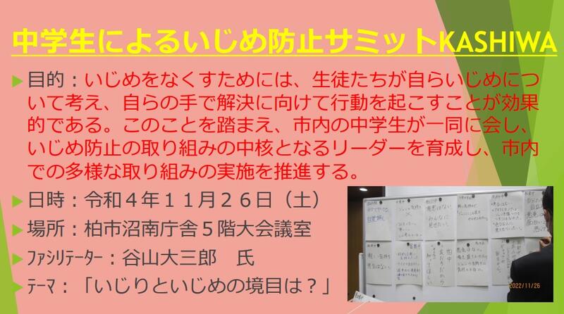 〇26日(土)に、柏市沼南庁舎において、柏市内の中学校21校の代表生徒が2名ずつ集まり、「いじめ防止サミットKashiwa」が開かれました。テーマは「いじりといじめの境目は?」で、柏市の田牧教育長の挨拶に続き、株式会社スタンドバイ代表取締役の谷山さんがファシリテーターとなって、参加者がグループで話し合う形式の学習でした。