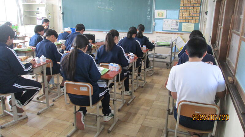 〇本日と明日、千葉県立及び柏市立高等学校の学力検査が行われます。昨日の給食は「味噌カツ丼」で、勝負事の前の「験担(げんかつぎ)」として縁起のよいメニューを全校生徒で食べ、3年生の合格祈願をしました。その後5校時、各教室にて事前指導を行いました。さすがに前日ということもあり、みんな少し緊張している表情もありましたが、無事に自分の力を出し切れるように祈っています。