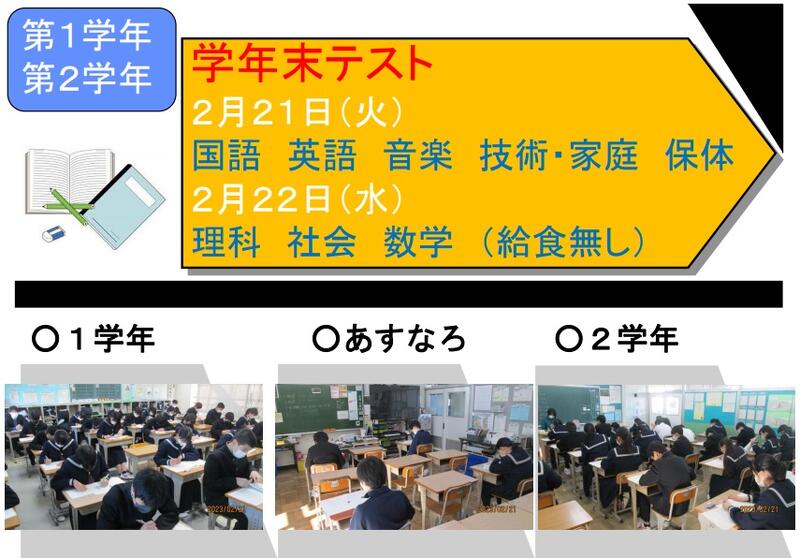 〇昨日と今日、3年生の千葉県公立高校入学者選抜に合わせて、1・2年生は今年度最後の定期テストを受けています。朝の登校時間にも参考書などを手に抱えている生徒も多く、意気込みが感じられます。一生の中で一番、知識や技能を脳に蓄えたり身につけたりすることの出来る時期ですので、今の自分を考えるとうらやましい気がします。