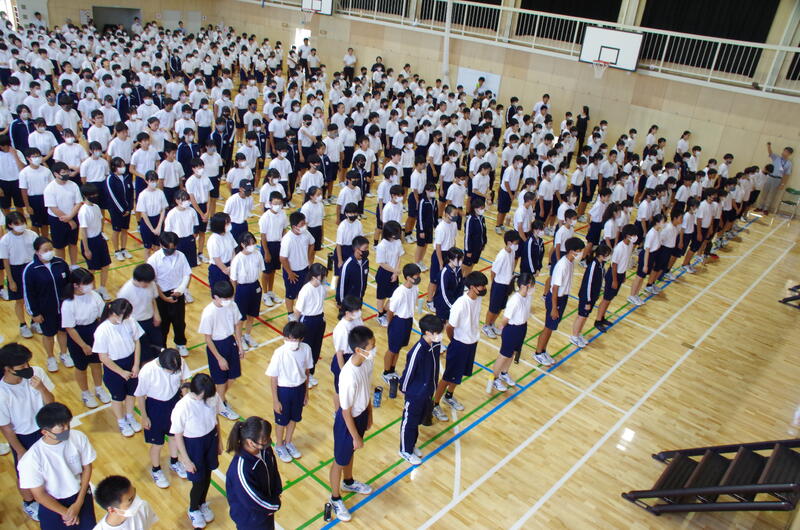 〇熱中症対策として、始業式をオンラインで実施することも検討しましたが、20分間という短時間で行うことを徹底した上で、体育館で行いました。