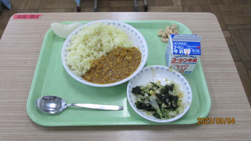 〇メニューは「牛乳、ドライカレーライス、わかめサラダ、梨、メープルカシューナッツ」でした。記録的な猛暑が続いたこの夏でしたが、ここにきて夏の疲れもたまっています。3食しっかり食べて、夏バテ予防に努めてほしいです。