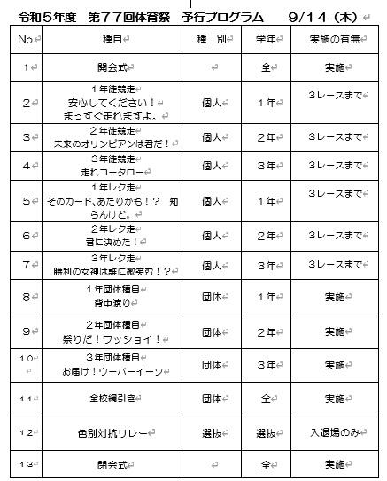 〇明後日の本番当日を想定し、予行練習を行います。一番の目的は、仮プログラムに沿って進めながら、係り生徒(出発・審判・用具・招集・放送・得点・救護など)の動きを確認し、それをもとに本日中に改善点を洗い出し、修正案を検討することです。