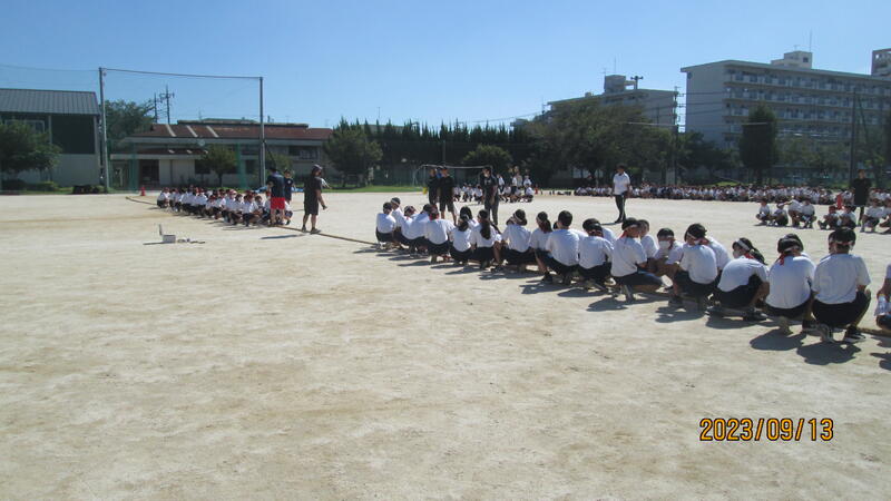 〇昨日から体育祭練習が本格的に始まりました。開閉会式の流れを確認したり、各学年ごとに、「徒競走」「レク走」「団体種目」の選手決めやルールの確認をしたりしています。今日は全校綱引きの隊形づくりや色別対抗リレーの練習を行います。