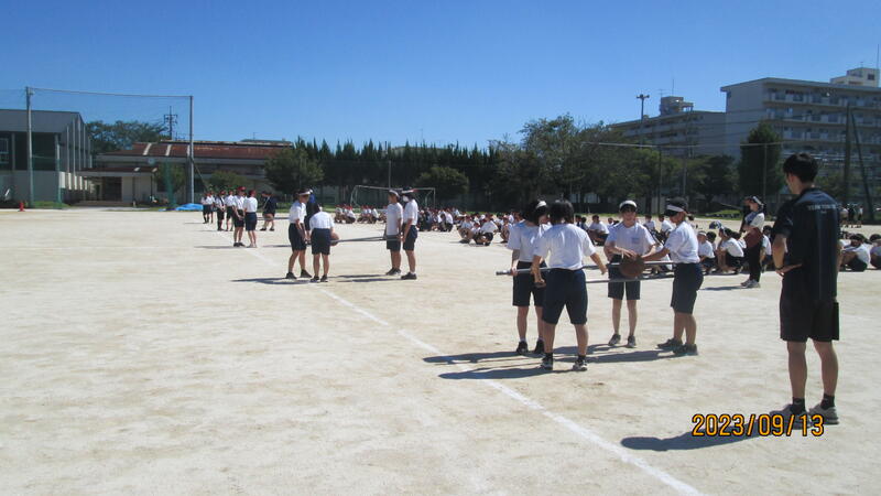 〇最初に応援リーダー(団)が一人ひとり自己紹介を行いました。その後赤組と白組の共通の応援コール(3種類)の練習を行いました。大太鼓のリズムに合わせ、生徒たちの掛け声と手拍子が校庭いっぱいに響いていました。