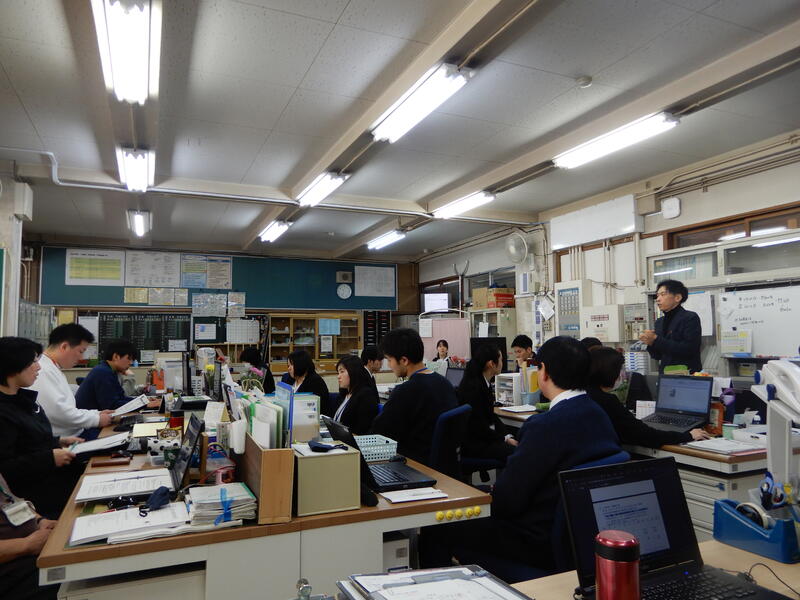 〇校内では教員が分担し、始業式に向けて会議や準備を行っています。特に本校は校舎配置が複雑ですので、新しく着任した職員はなかなか覚えられず、行きたい教室へも行けずに迷子になることもあります。