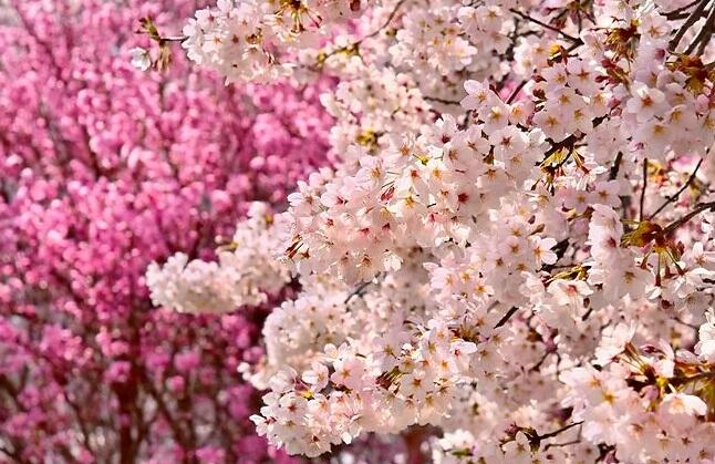 〇サクラも複数の品種が交配してできた変種や観賞用に開発された改良品種を合わせると600種類を超えるといわれています。日本に分布している桜のうち80%以上がソメイヨシノだそうですが、実は他にも個性溢れる品種が多く存在しています。花弁の数も影響してか、本校の八重桜はピンクも濃く、花全体がモコモコしています。