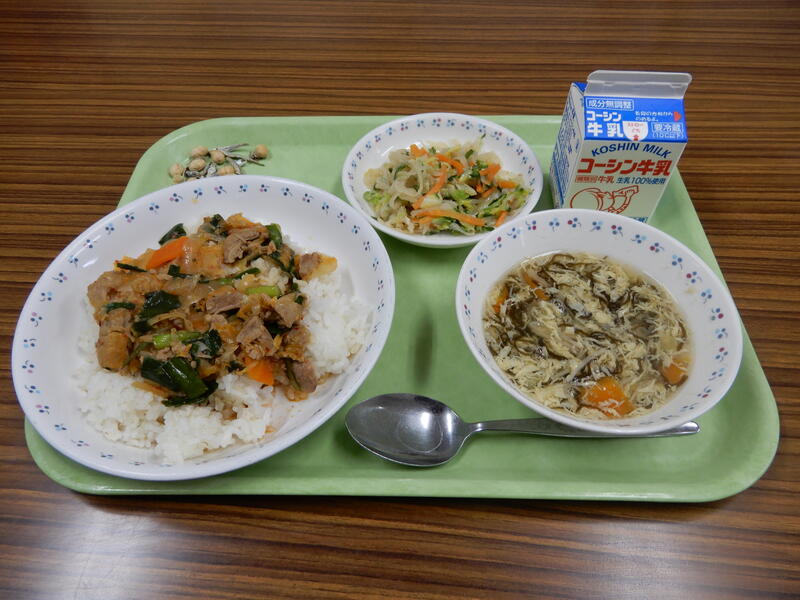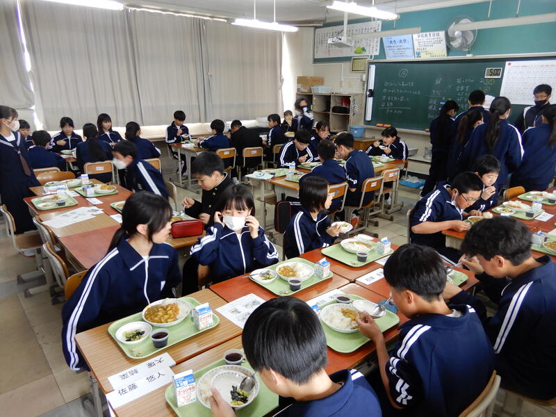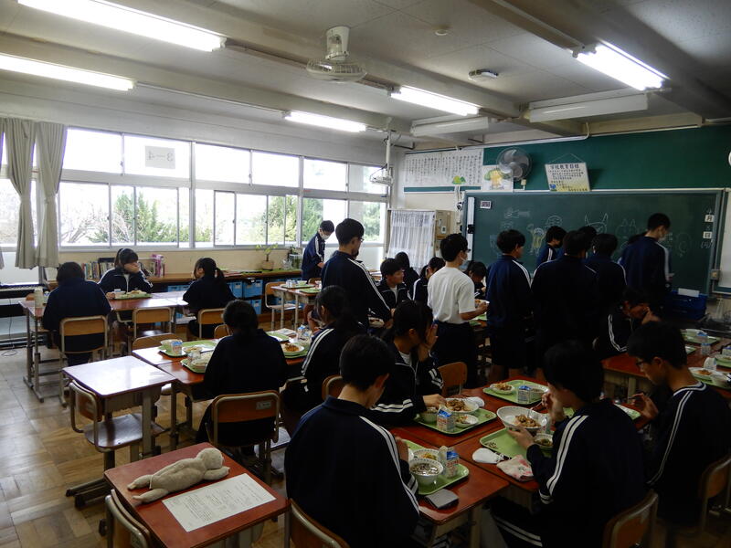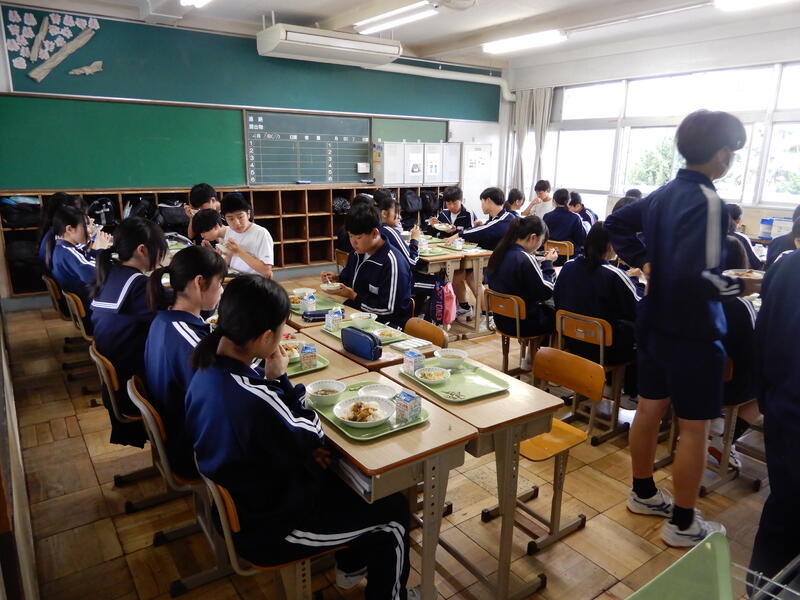 〇給食は、アフターコロナで班の隊形で会食することに戻りました。ただ大声で話したり食事マナーを守らない生徒は皆無で、豚キムチ丼を美味しそうに食べていました。