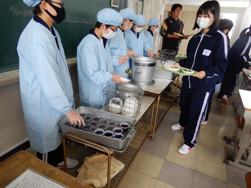 〇1年生は、初めての中学校の給食でした。まずは給食当番が白衣を着るところから勝手の違いに苦労していました。さらに配膳や「いただきます」の挨拶もクラスごとに少しずつ違っています。当番以外は読書をして待ちます。
