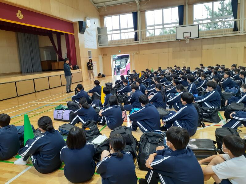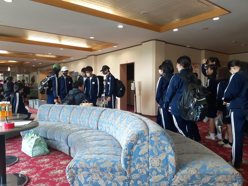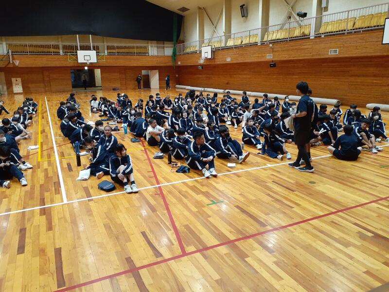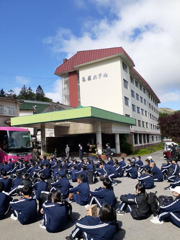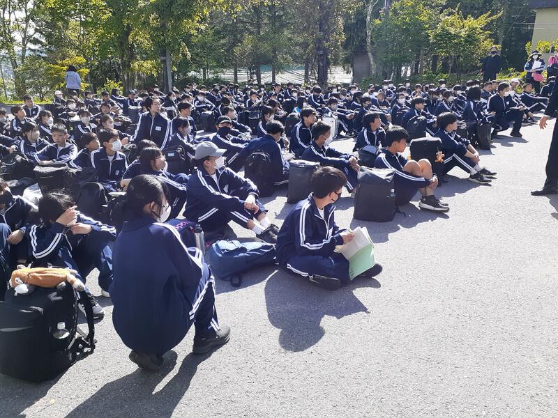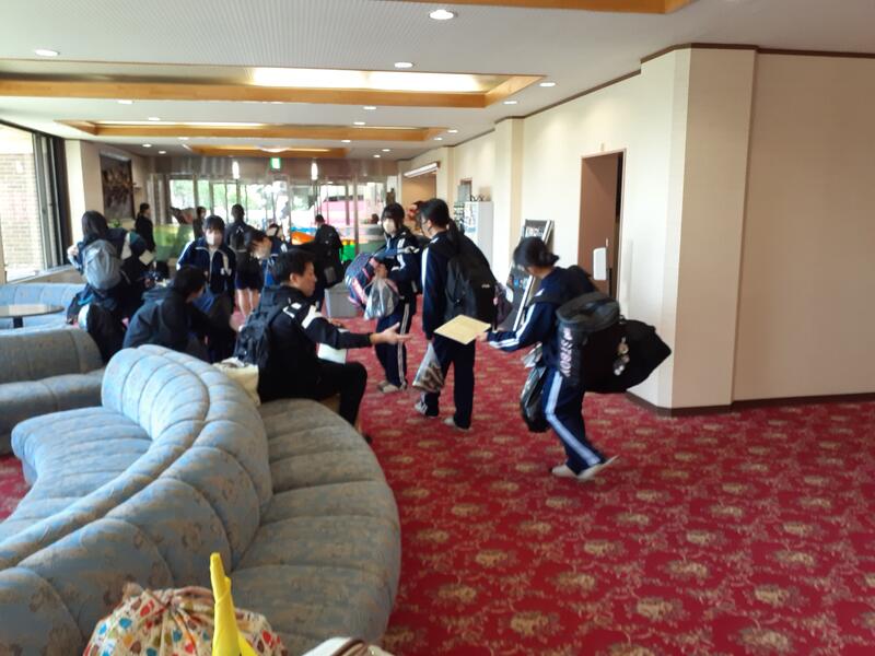○白樺湖のほとりにあるホテルに到着しました。体育館で入館式を行います。支配人にあいさつし、これから行うウォークラリーの説明を聞きました。