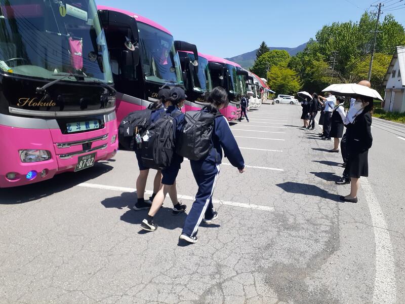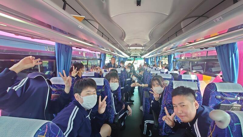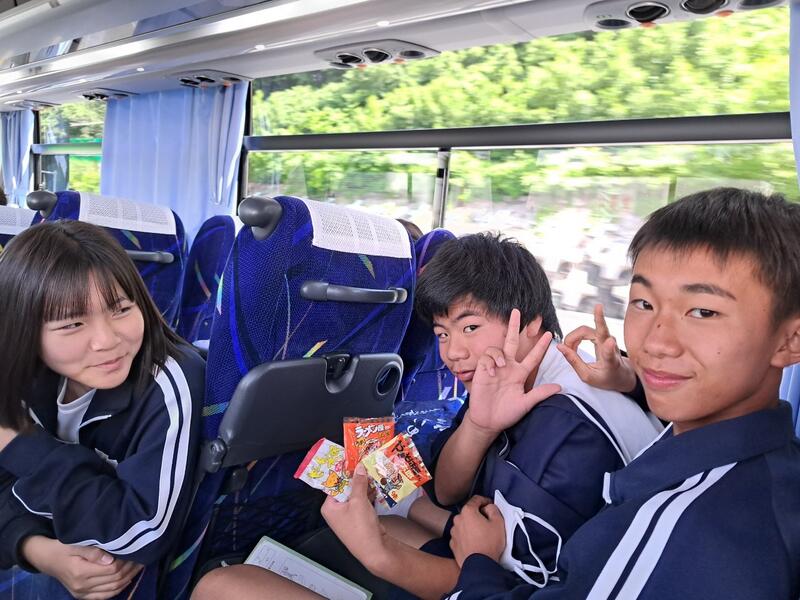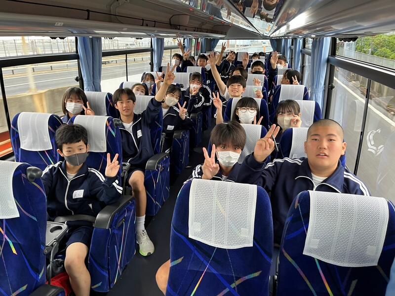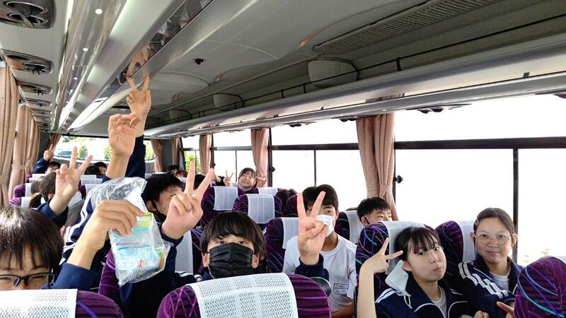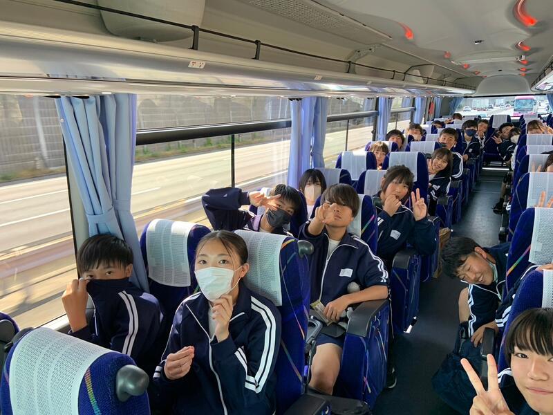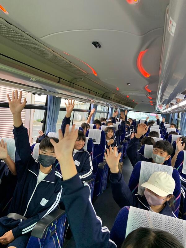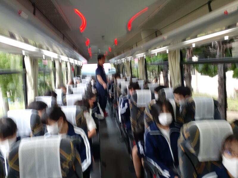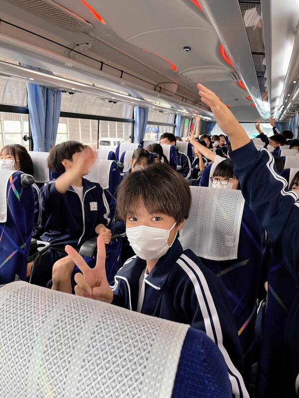 ○バスに乗り込み、見送りの先生方に手を振って、出発です。