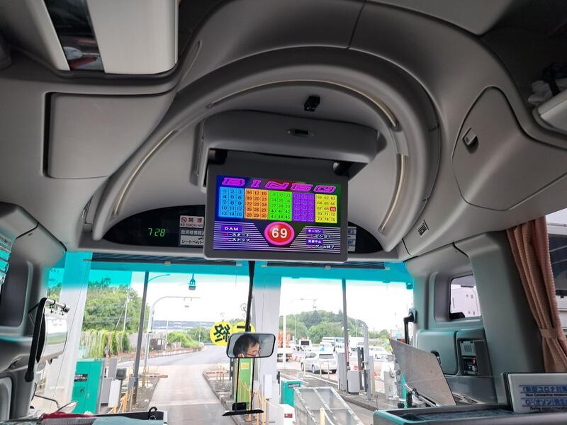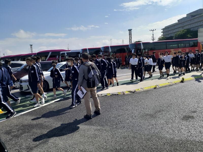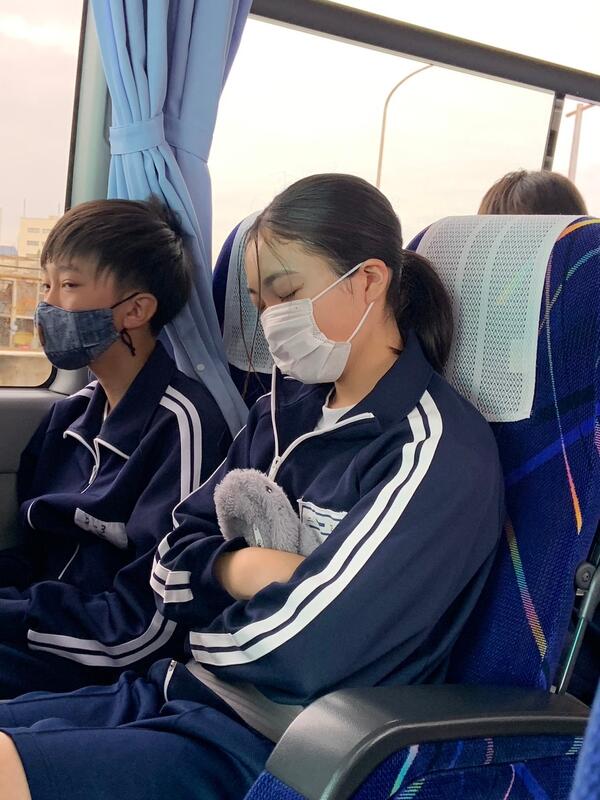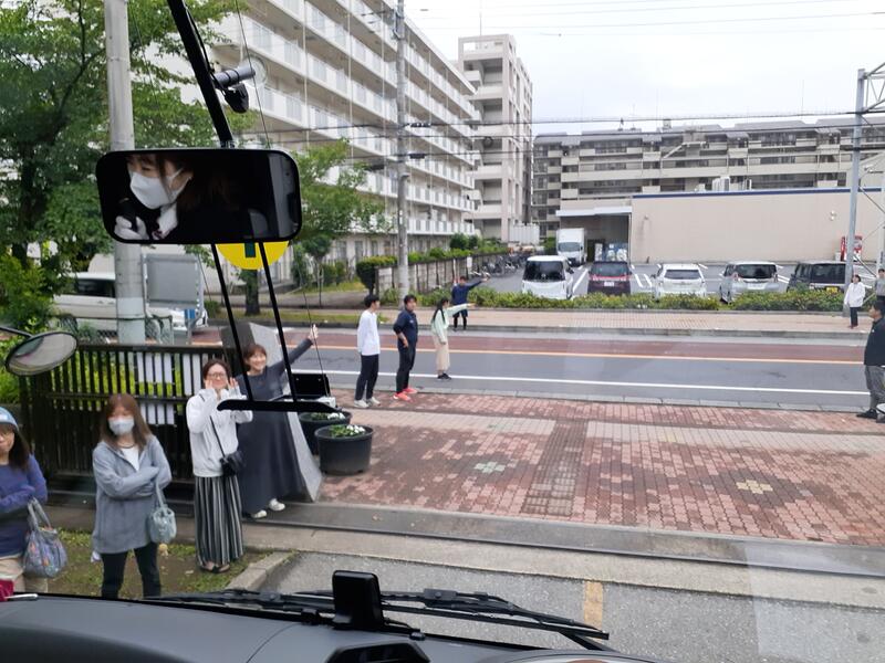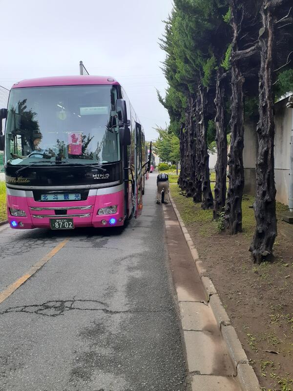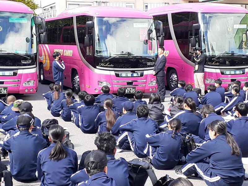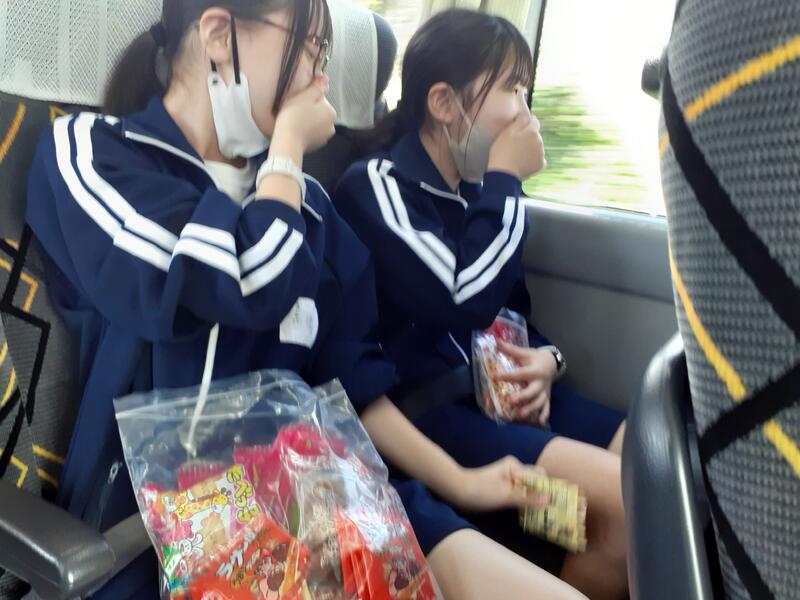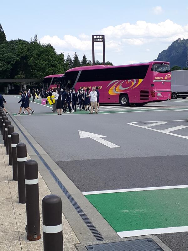 ○バスに乗り込み、見送りの先生方に手を振って、出発です。