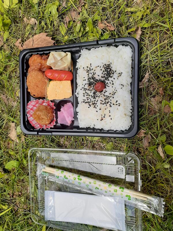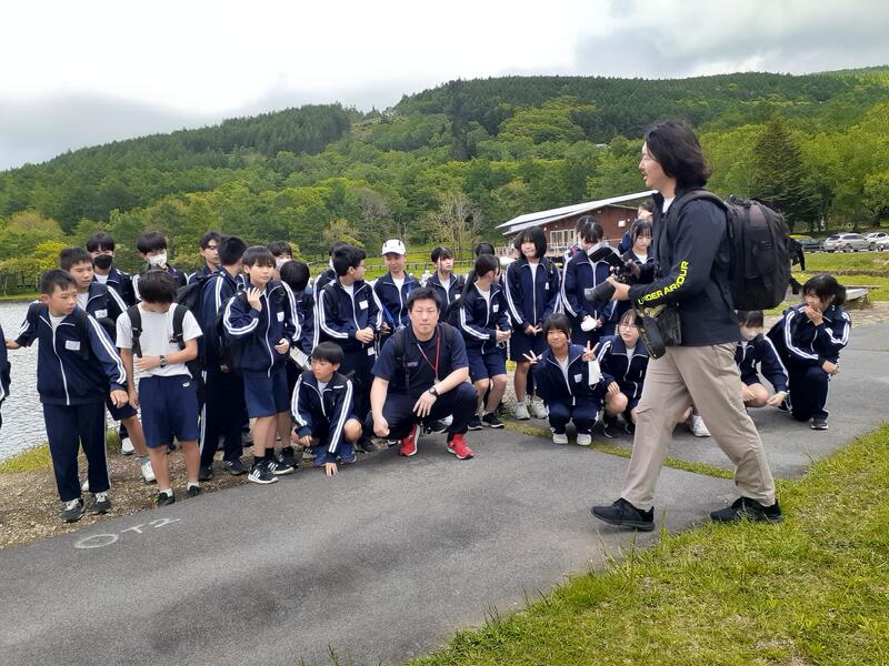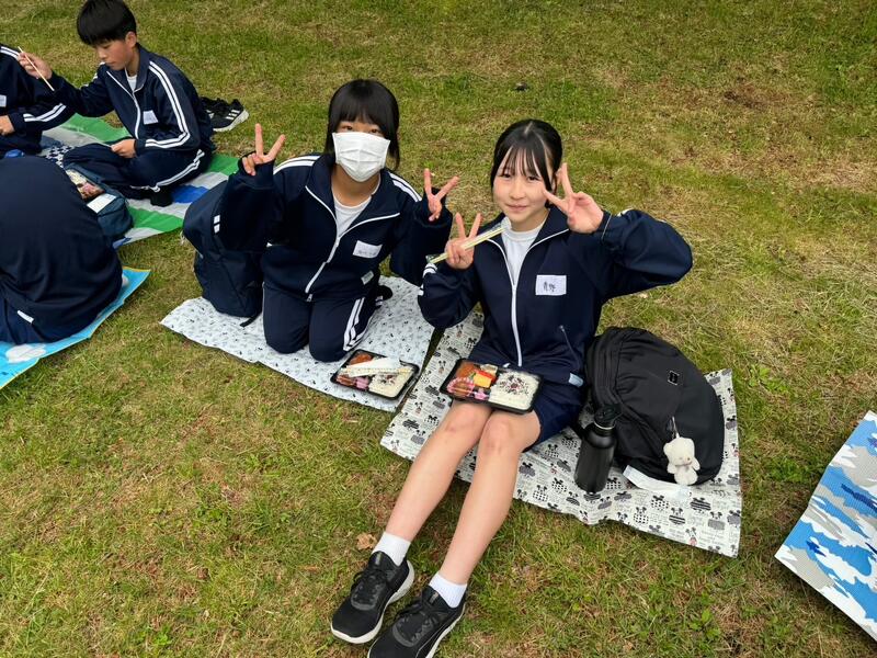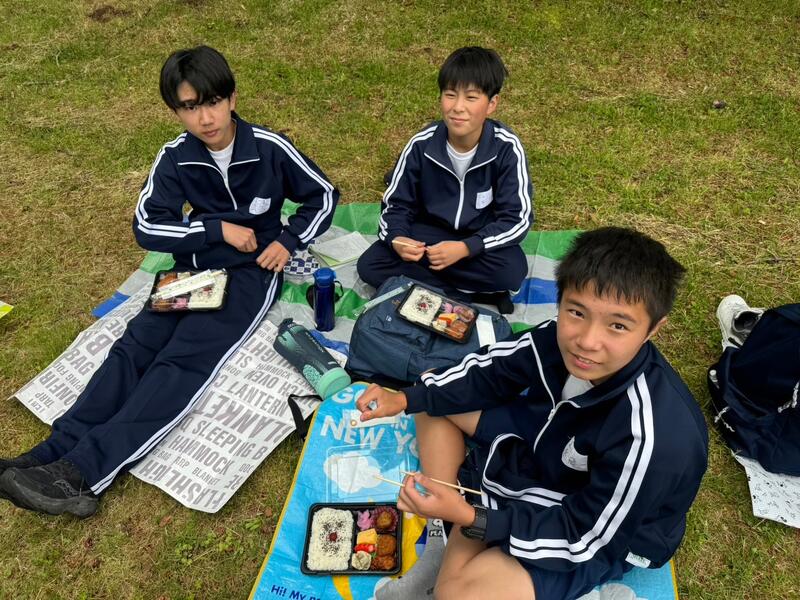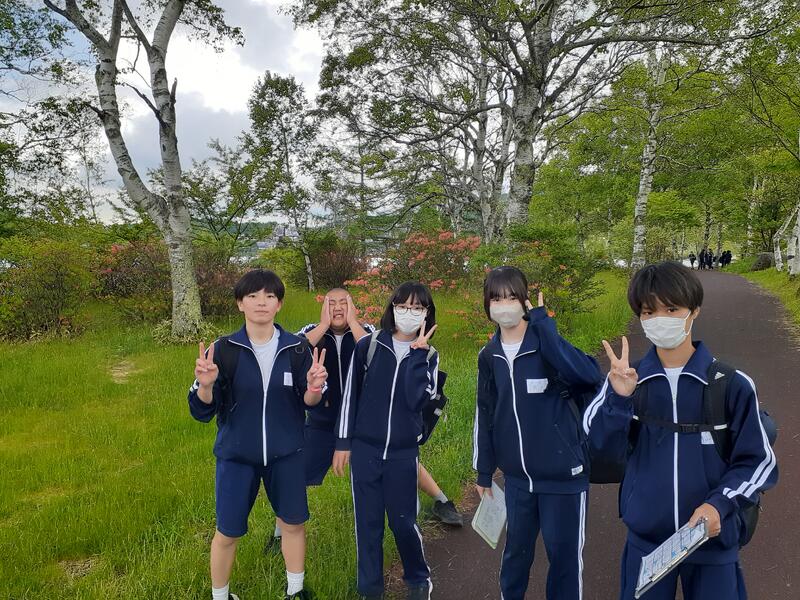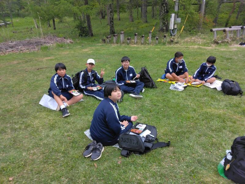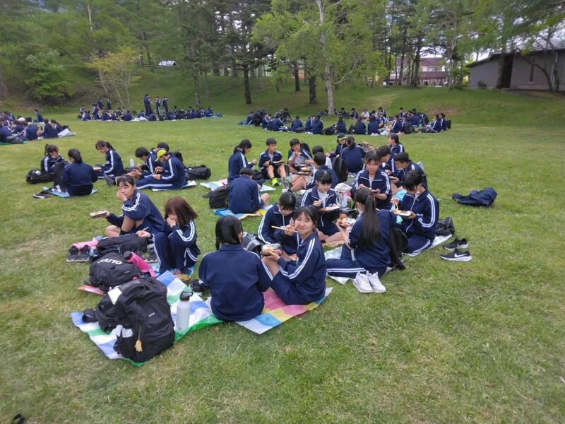 ○女神湖でクラス写真を撮り、お弁当をたべます。少し雨がバラバラきています。標高1500mで、爽やかです(寒いくらい)。「お腹すいた~」という声があちこちから聞こえます。日差しが戻りました。