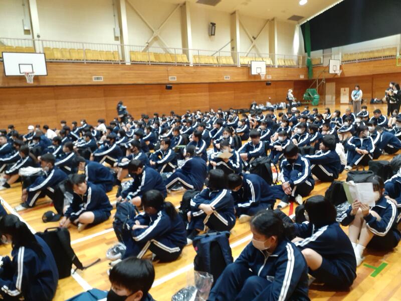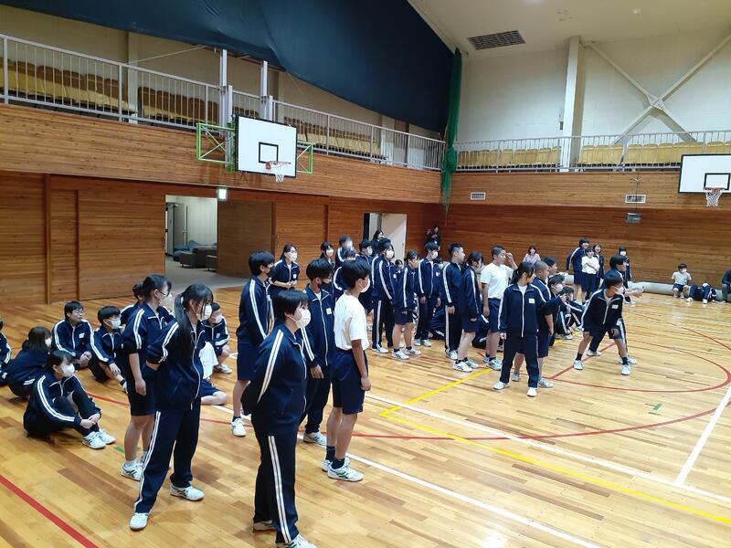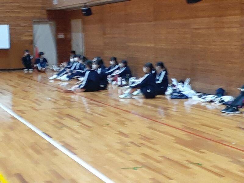 ○雨があがりましたが、校庭はぬかるんでいるので、体育館で出発式を行います。