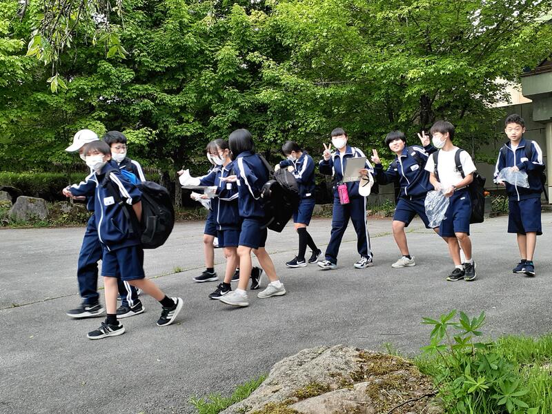 〇一昨日の放課後、3年生のボランティア95名で、学区内のゴミを拾って歩く活動を行いました。目的を2つに定めました。