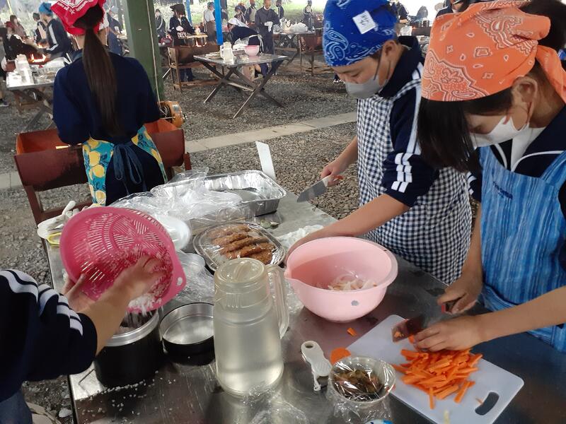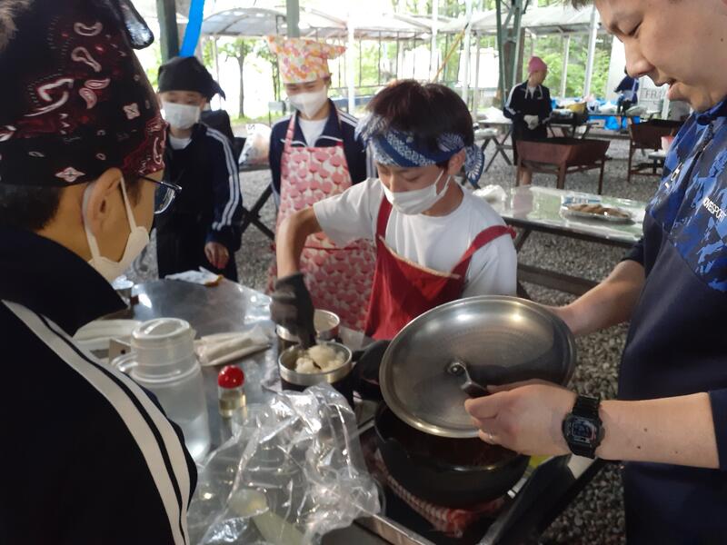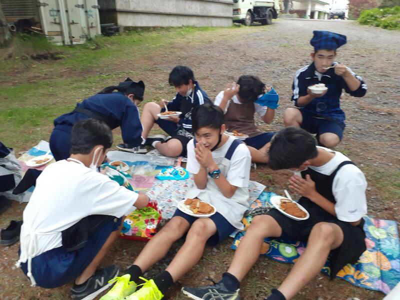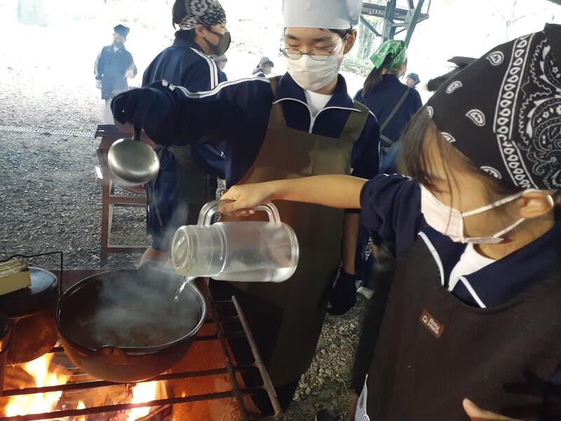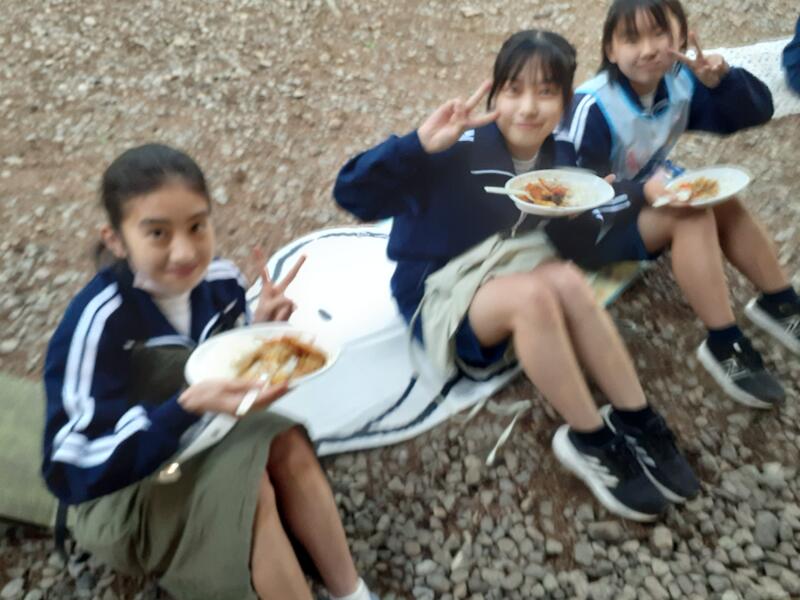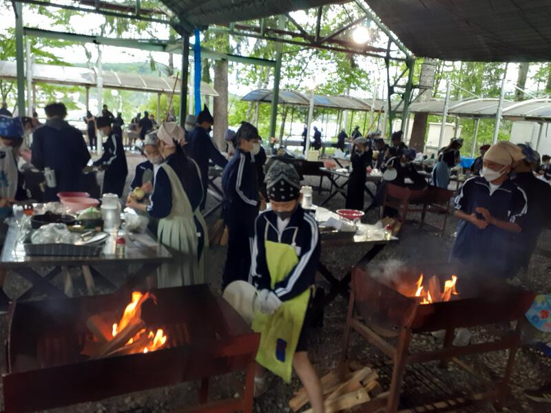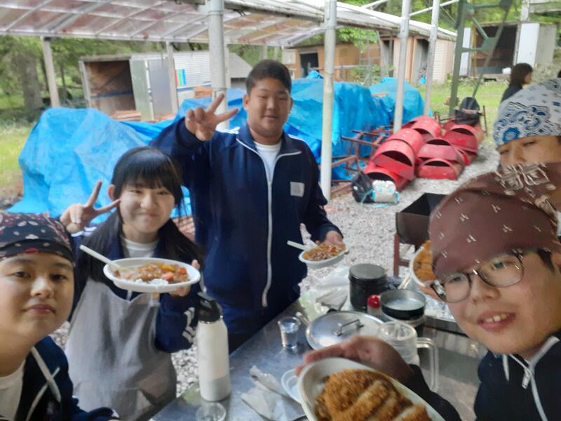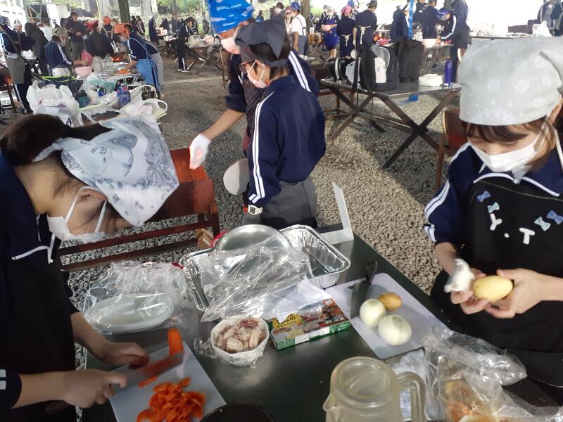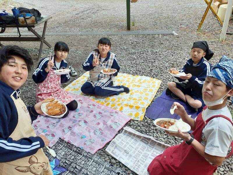 ○ゆっくり休む間もなく、カレーライスづくりに入ります。炊事場は屋根があるので、雨でも問題はありません。ただし例年ですと、一年生の時に、カレーライスづくりを校外学習で行っていますが、昨年は川越市のフィールドワークにかえたので、さて上手く出来るでしょうか?楽しみです。カレーができたら、かつをのっけて、かつカレーにします。ご飯の芯があったり、逆に水分が多くてペチャペチャだったり、「やった!」「残念!」など、イロイロは本音が聞けます。