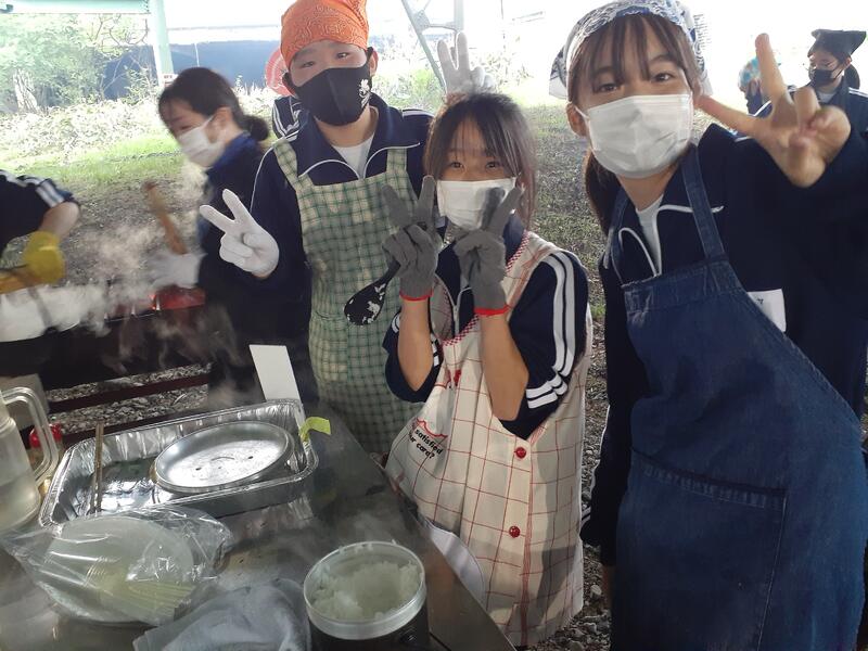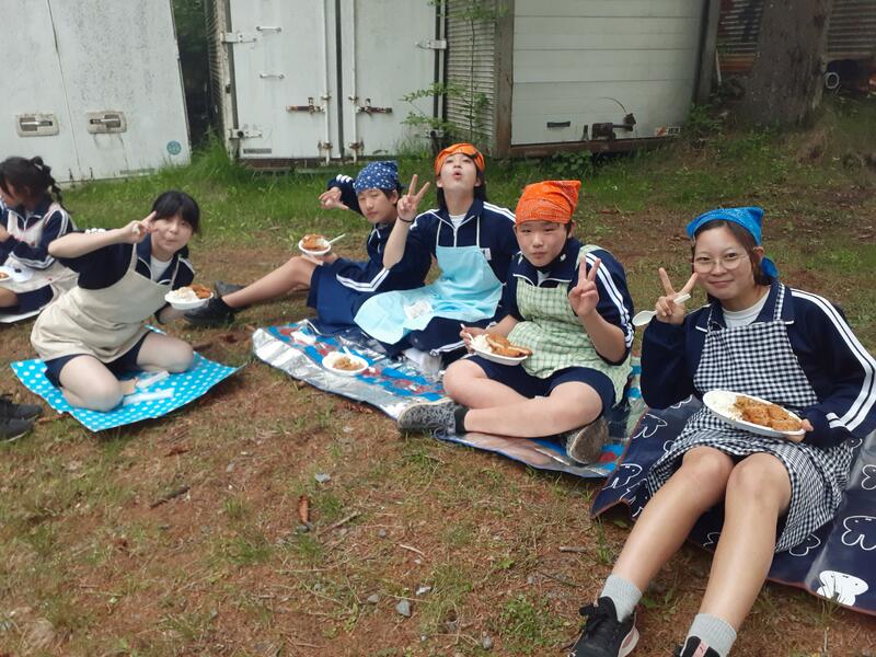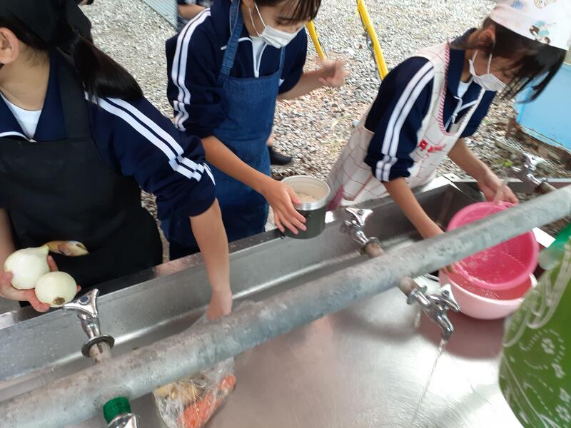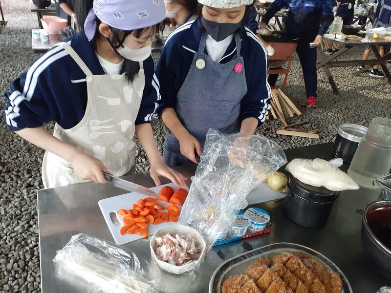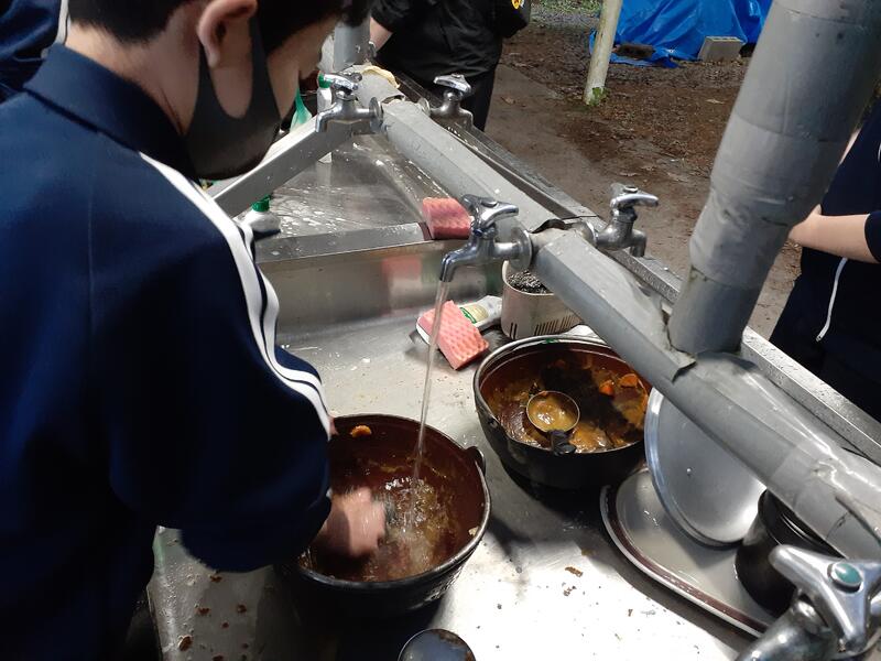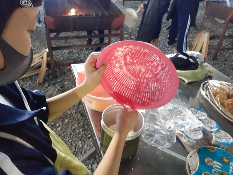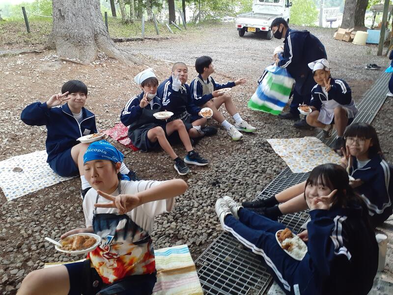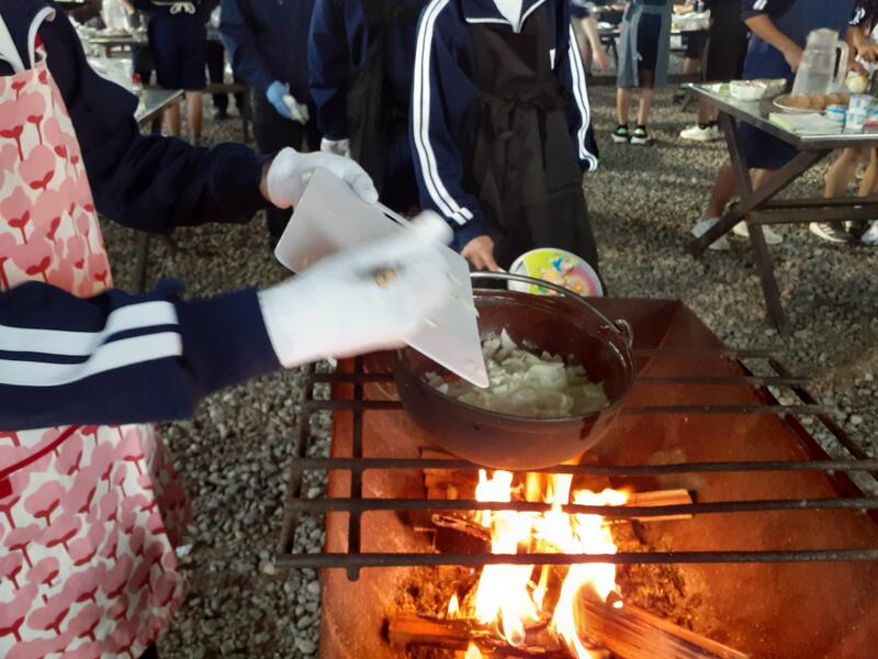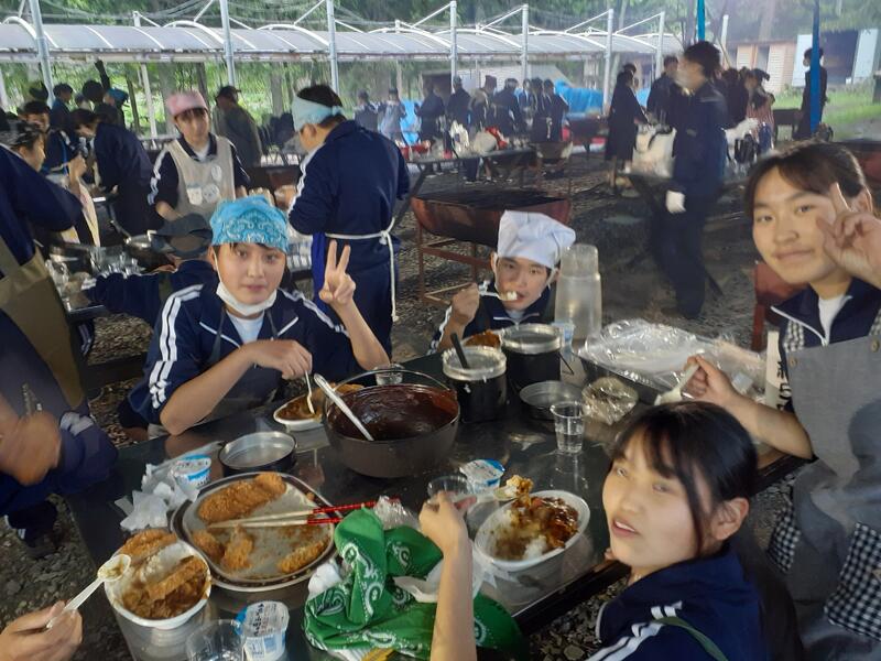 ○ゆっくり休む間もなく、カレーライスづくりに入ります。炊事場は屋根があるので、雨でも問題はありません。ただし例年ですと、一年生の時に、カレーライスづくりを校外学習で行っていますが、昨年は川越市のフィールドワークにかえたので、さて上手く出来るでしょうか?楽しみです。カレーができたら、かつをのっけて、かつカレーにします。ご飯の芯があったり、逆に水分が多くてペチャペチャだったり、「やった!」「残念!」など、イロイロは本音が聞けます。