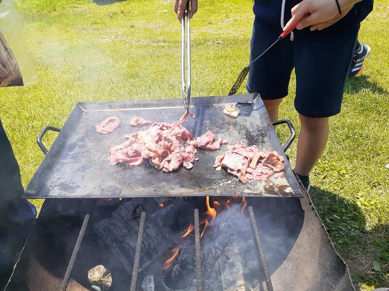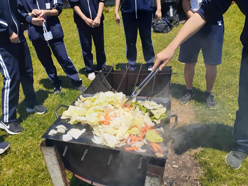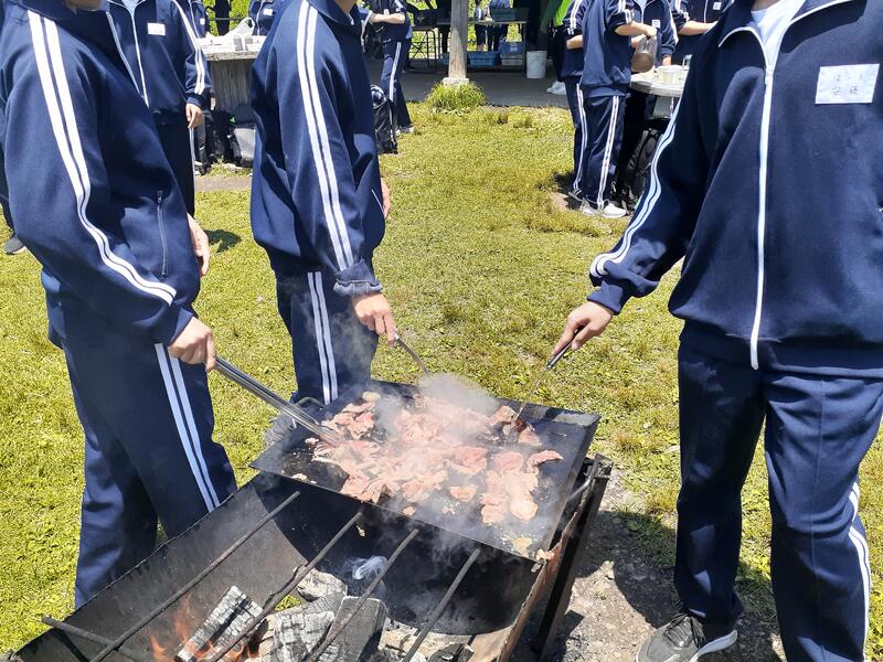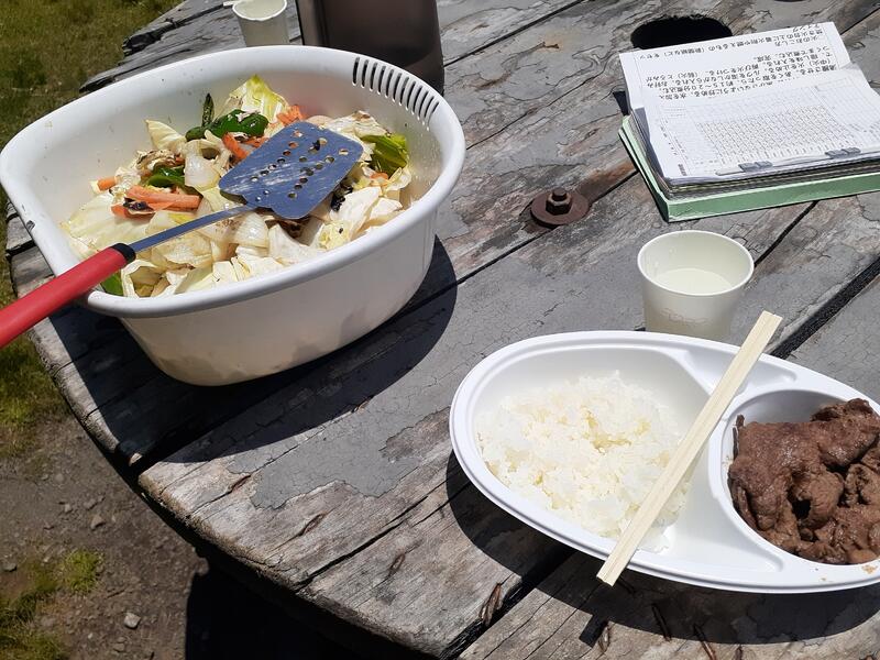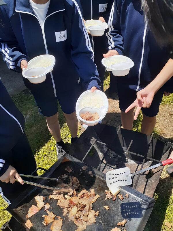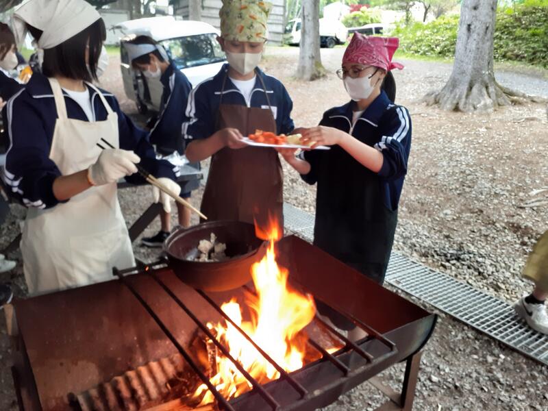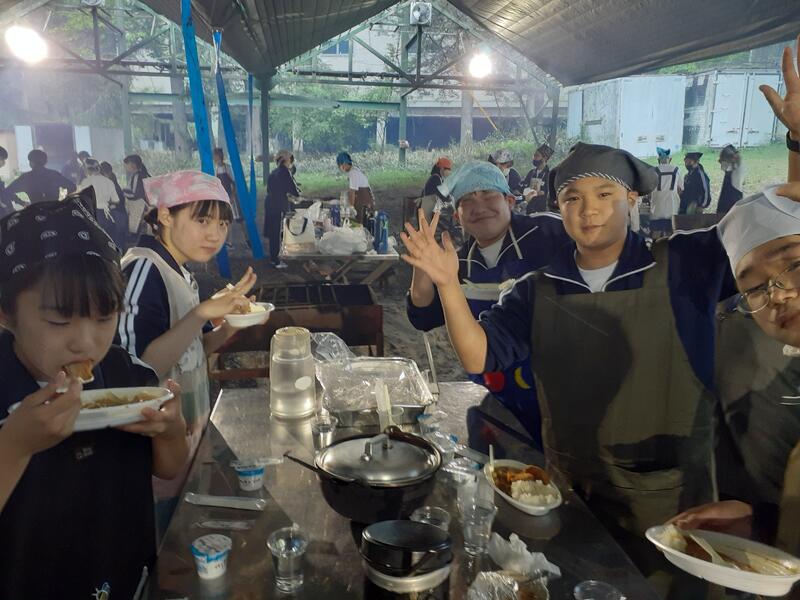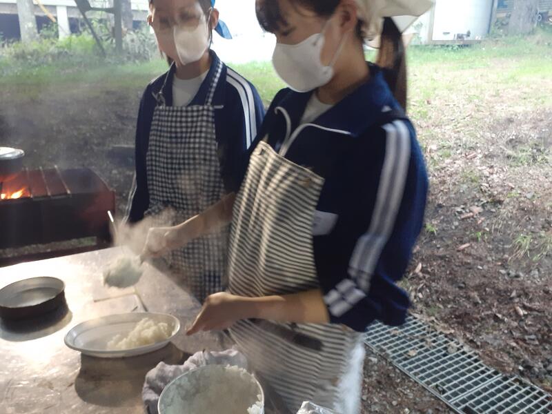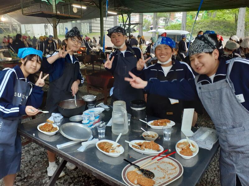 ○ゆっくり休む間もなく、カレーライスづくりに入ります。炊事場は屋根があるので、雨でも問題はありません。ただし例年ですと、一年生の時に、カレーライスづくりを校外学習で行っていますが、昨年は川越市のフィールドワークにかえたので、さて上手く出来るでしょうか?楽しみです。カレーができたら、かつをのっけて、かつカレーにします。ご飯の芯があったり、逆に水分が多くてペチャペチャだったり、「やった!」「残念!」など、イロイロは本音が聞けます。