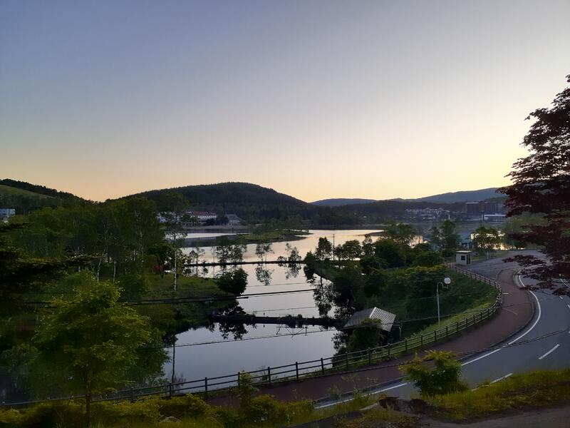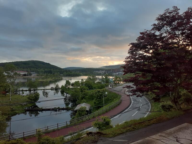 ○朝5時、目の前の白樺湖は晴れています。間もなく生徒の起床時間です。