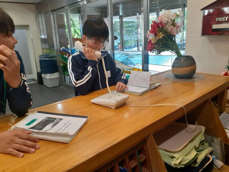 ○ホテルのロビーで家族への買い物です。並行せて、今日の体験学習の振り返りを行っています。