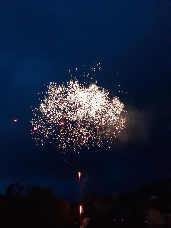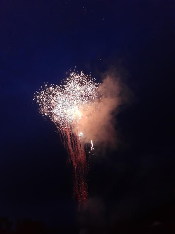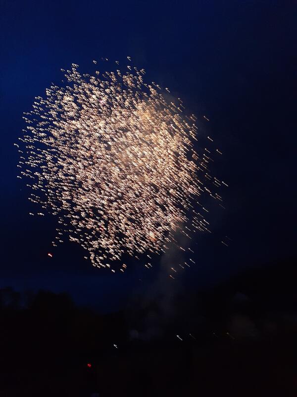 ○お待ちかねのキャンプファイアです。白樺湖に夕闇がせまってきました。火之神とその精霊による点火の儀式のあと、フォークダンスで歓声をあげています。最後は、オクラホマミキサーです。良い思い出になることでしょう、アンコールの声が止まず。フィナーレは「コスモス」を学年合唱しました。打ち上げ花火はサプライズです。