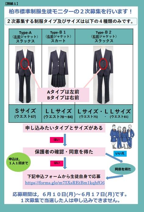 〇また、市教委から先日のモ ニ ター募集 の結果、定 数 に 満 た な い 制 服 の タ イ プ 及 び サ イ ズ があ っ たとのことです。そのため、 該 当 タ イ プ 及 び サ イ ズ の 2 次 募 集 を 行うという知らせがと届きました。 学 校 連 絡 シ ス テ ム s i g f y で、以下のような 通 知がいきますので、もしご希望があればご応募ください。尚、前回と同様に、当 選 確 定 後 の 制 服 タ イ プ や サ イ ズ 変 更 は で き ないそうですので、ご 注 意 く だ さ い 。