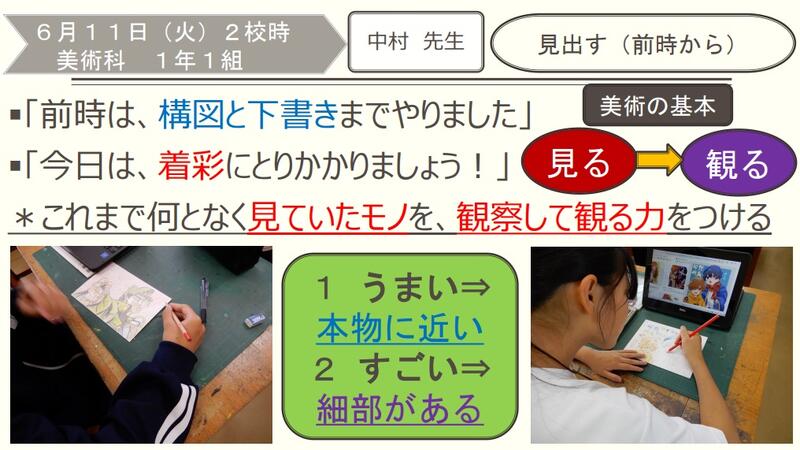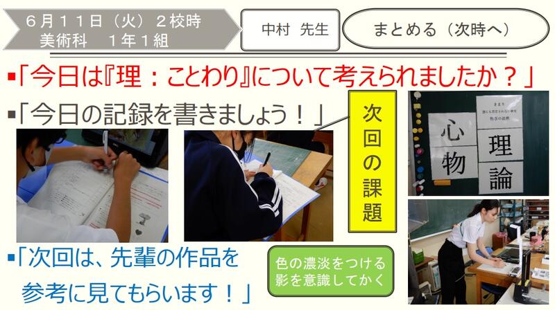 〇生徒の取り組みを見ていると、創造的に表す技能の育成は美術の創造活動にとって重要であり、生徒一人一人の個性が光っていて、楽しいです。