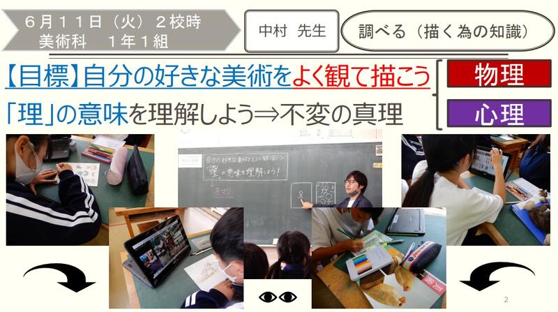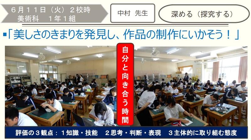〇美術の最初の目標は、身の回りの対象や事象を捉える造形的な視点について理解するとともに、意図に応じて表現方法を工夫して表すことができるようにします。自然の造形や美術作品などの造形的なよさや美しさ、表現の意図と工夫、機能性と美しさとの調和、美術の働きなどについて考え、主題を生み出し豊かに発想し構想を練ったり、美術や美術文化に対する見方や感じ方を広げたりすることができるように工夫しています。