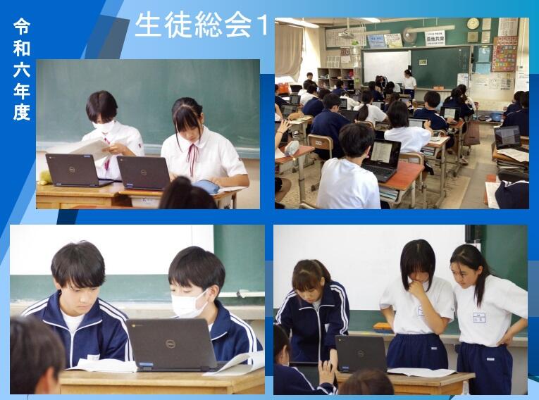 〇一昨日の5,6校時に、今年度の生徒総会を行いました。前半は各学級にて、学級委員または学級議長が司会を務め、「昨年度の活動及び今年度の予算案」を議事として、質問や意見・その返答の後、採決しました。