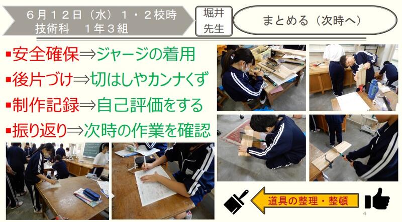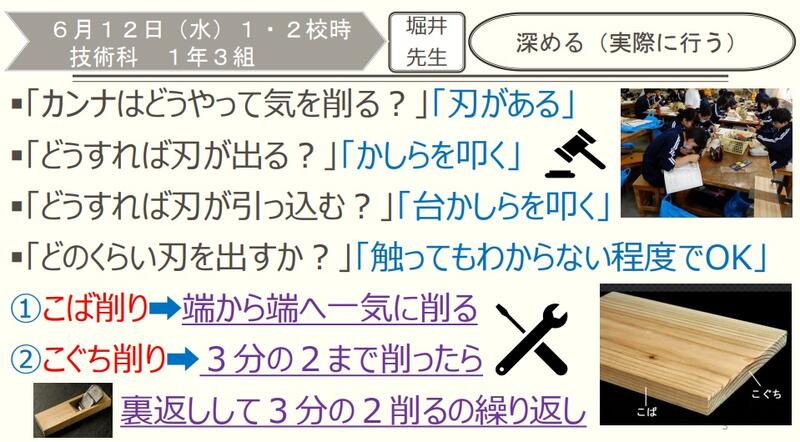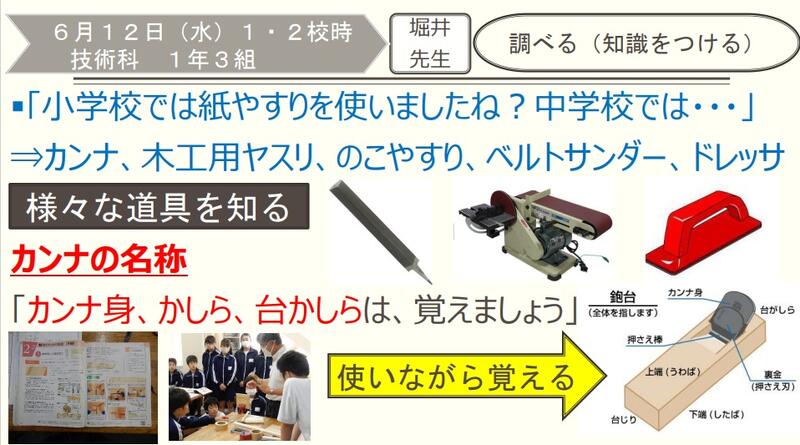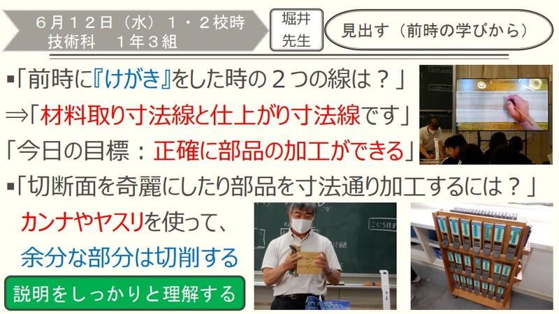〇技術科では、材料と加工の技術の見方・考え方を働かせた実践的・体験的な活動を通して、生活や社会で利用されている材料と加工の技術についての基礎的な理解を図り、それらに係る技能を身に付け、材料と加工の技術と生活や社会、環境との関わりについて理解を深めることをねらいとしています。