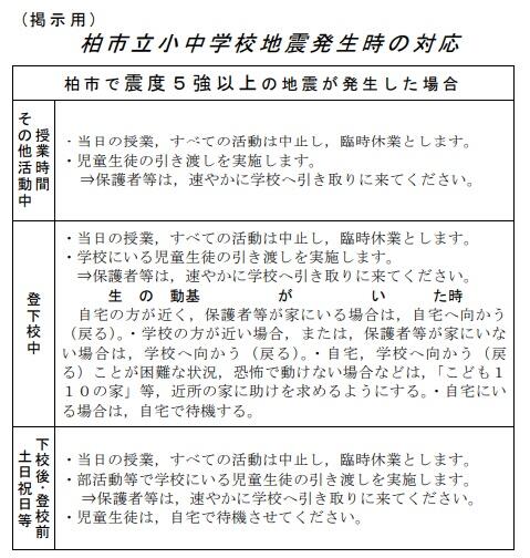 〇「柏市小中学校地震発生時の対応」マニュアルでは、もし学校が課業している時間内に、震度5強以上の地震が発生した場合、生徒を学校に留め置き、保護者等に児童生徒を引き渡すことになっています。となると昨年のような実際の引き渡しの前に、今年のように「〇〇さんの保護者は何時ごろ学校に来られる」レベルの情報を学校が把握していないと、大パニックになる可能性があります。