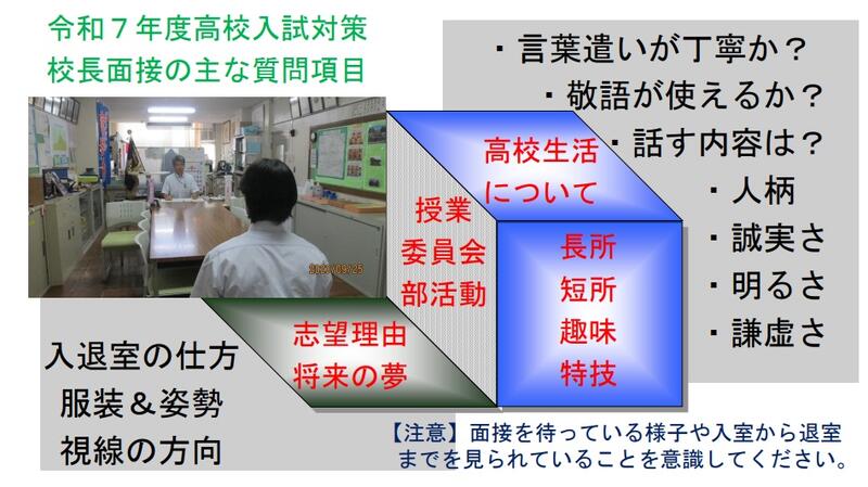 〇私も校長として千人くらいの面接をしてきましたので、同じようなこともできますが、高校の面接官との一番の違いは、普段から同じ学校で過ごしていますので、学校で見たり聞いたりする本人の情報量がはるかに多いことです。またこの3年生は入学当初から知っていますので、質問も一般的なことよりももっと具体的な内容になるかもしれません。楽しみです。